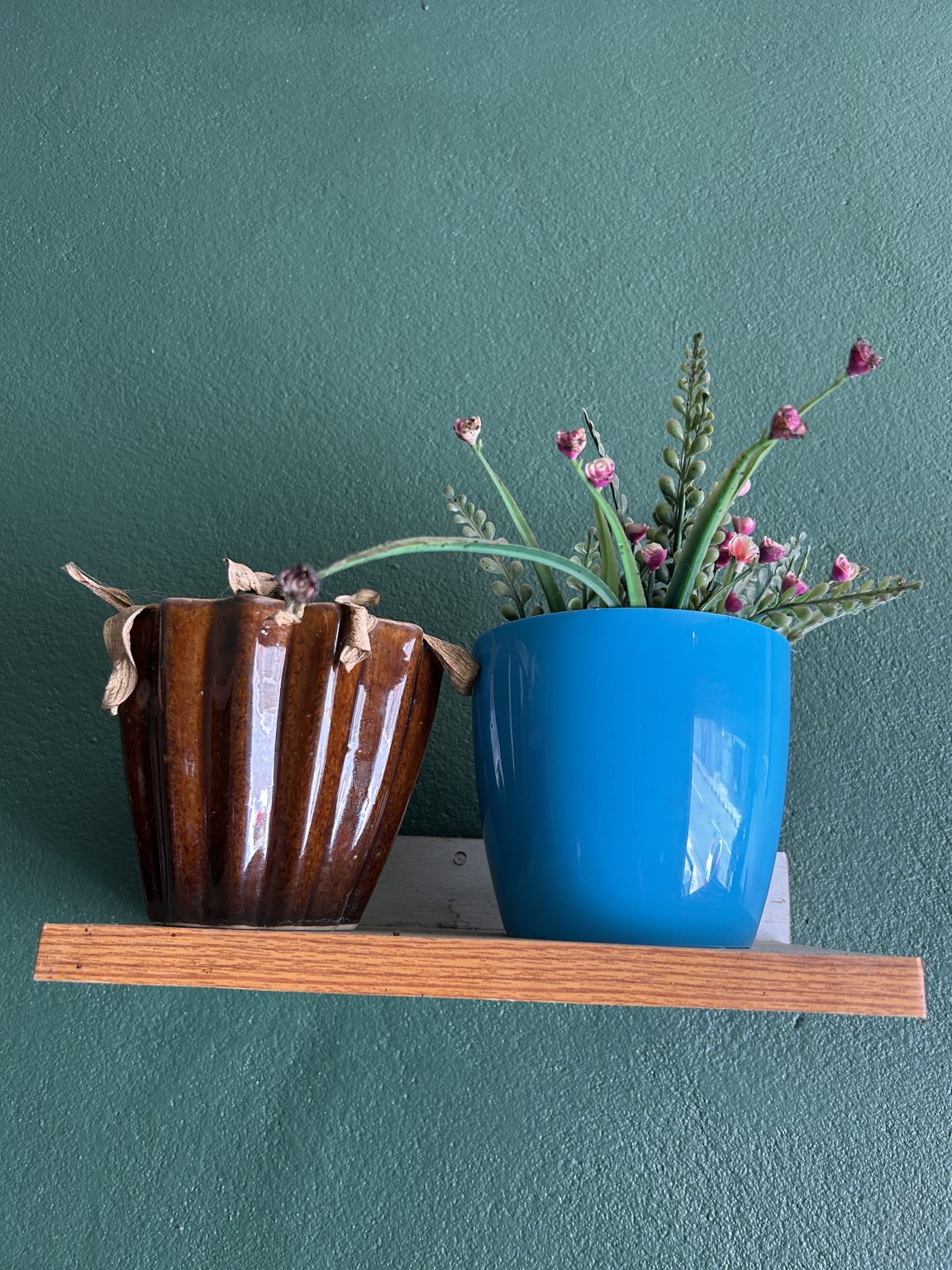 Alternative Text: A wooden shelf mounted on a green wall holds two pots.