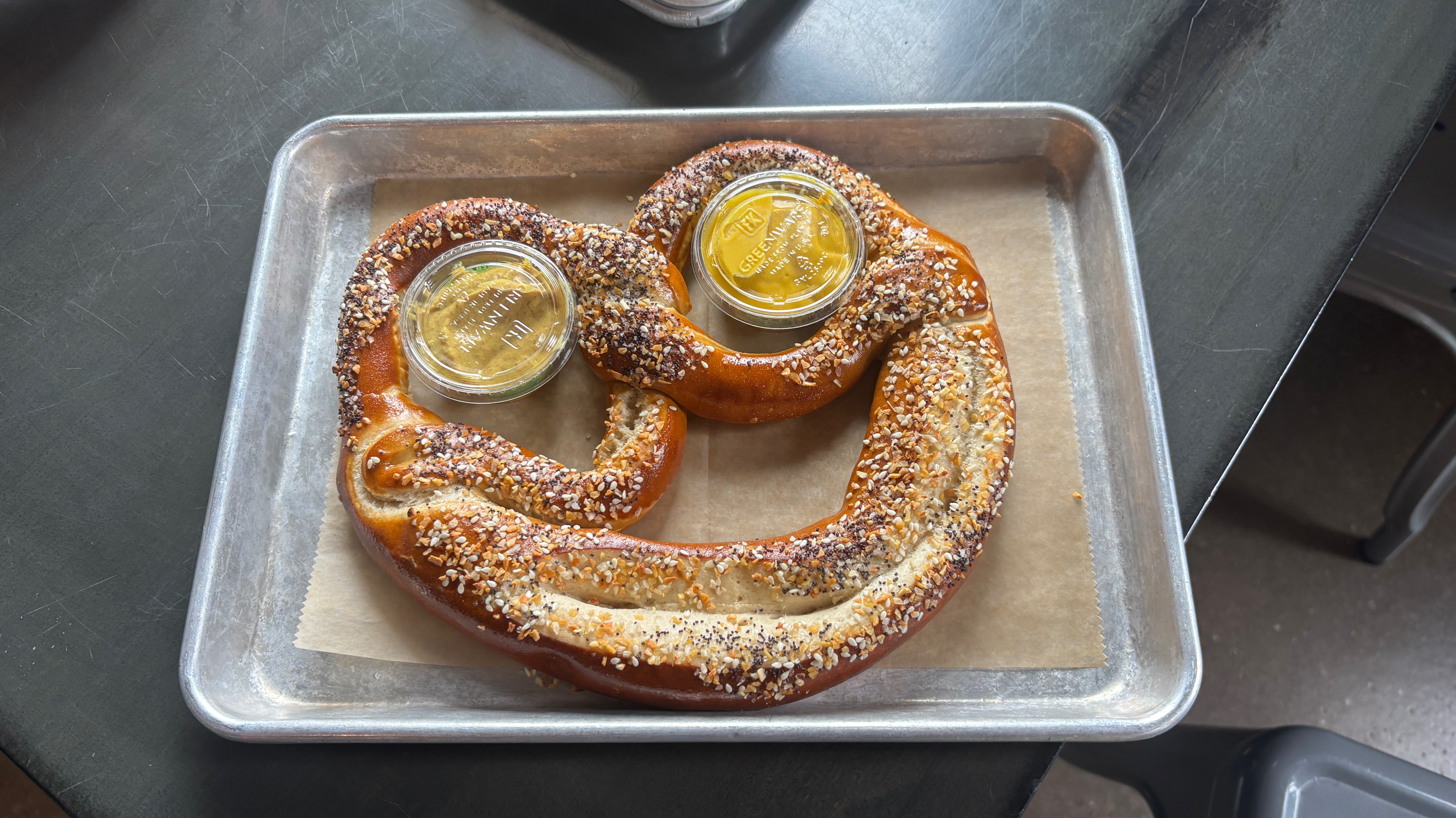 Alternative Text: A large pretzel on a steel pan, with tubs of mustard in the top parts, so it looks like a smiling face. The pretzel is covered in seasonings.