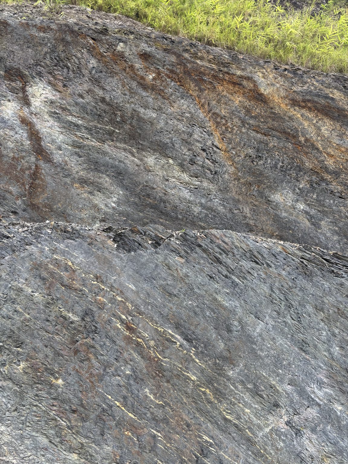 Alternative Text: A close-up view of textured rock layers, showcasing a mix of dark gray and black hues with subtle streaks of brown and gold.