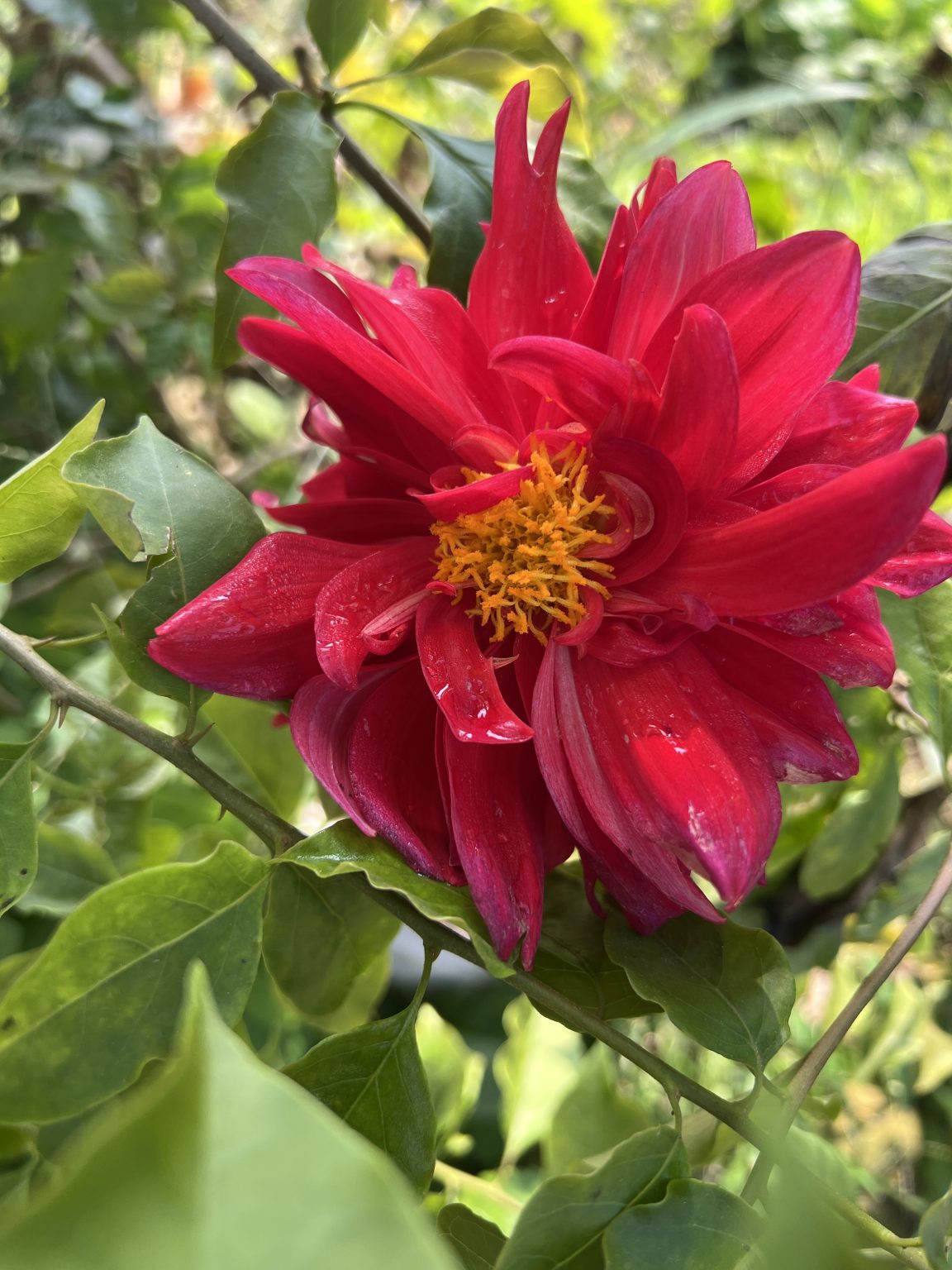 Alternative Text: A local red dahlia, known as ‘lahure flower’ in Nepal, with a bougainvillea branch and leaves in the background.