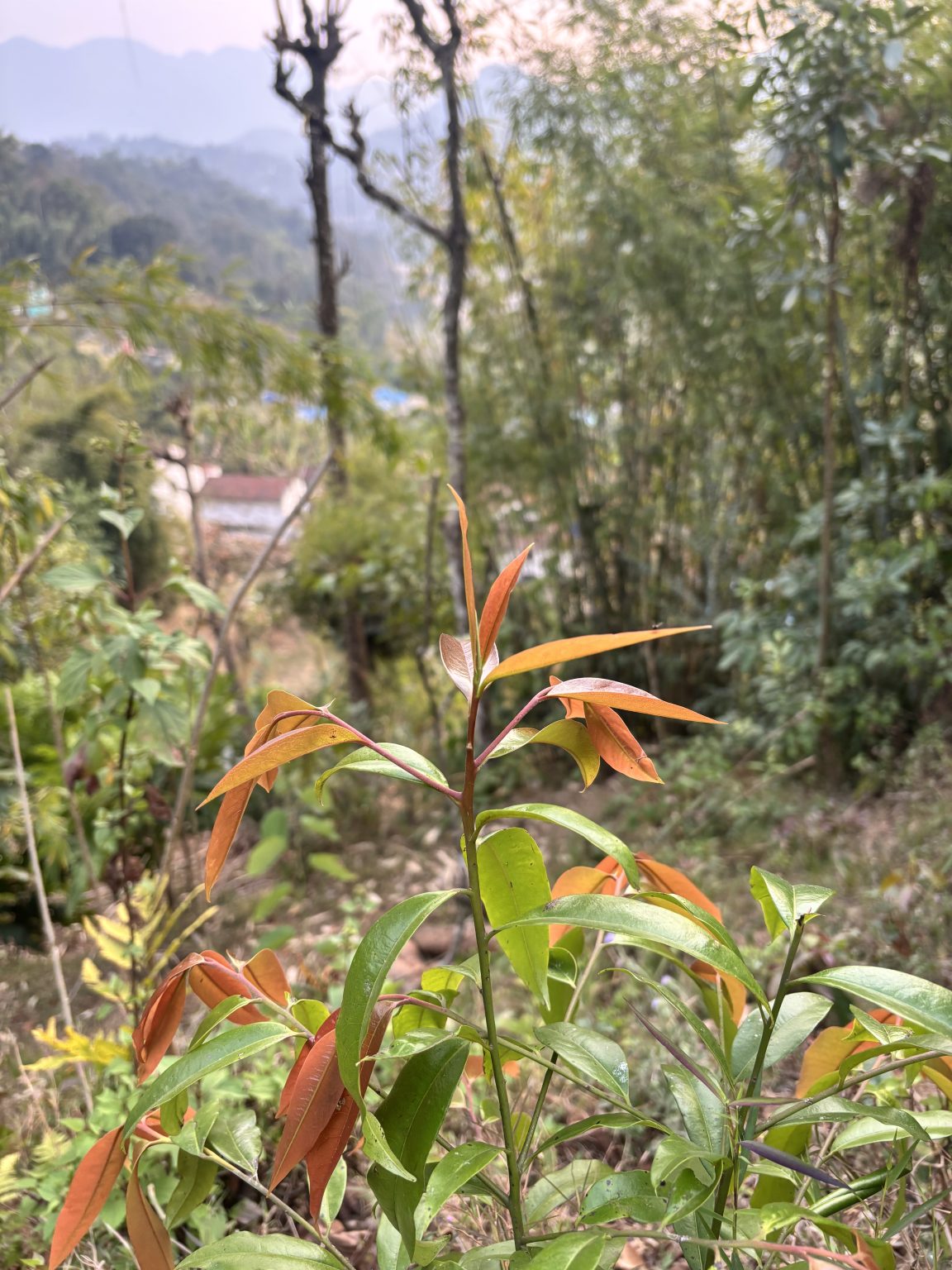 Alternative Text: A close-up view of a small plant with vibrant green leaves and some reddish-orange tips, situated in a natural landscape.