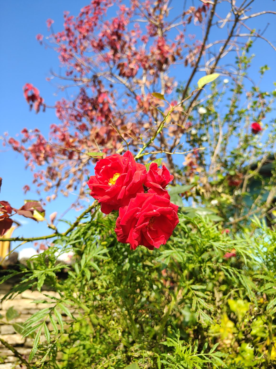 Alternative Text: A close-up of vibrant red roses blooming amidst lush green foliage.