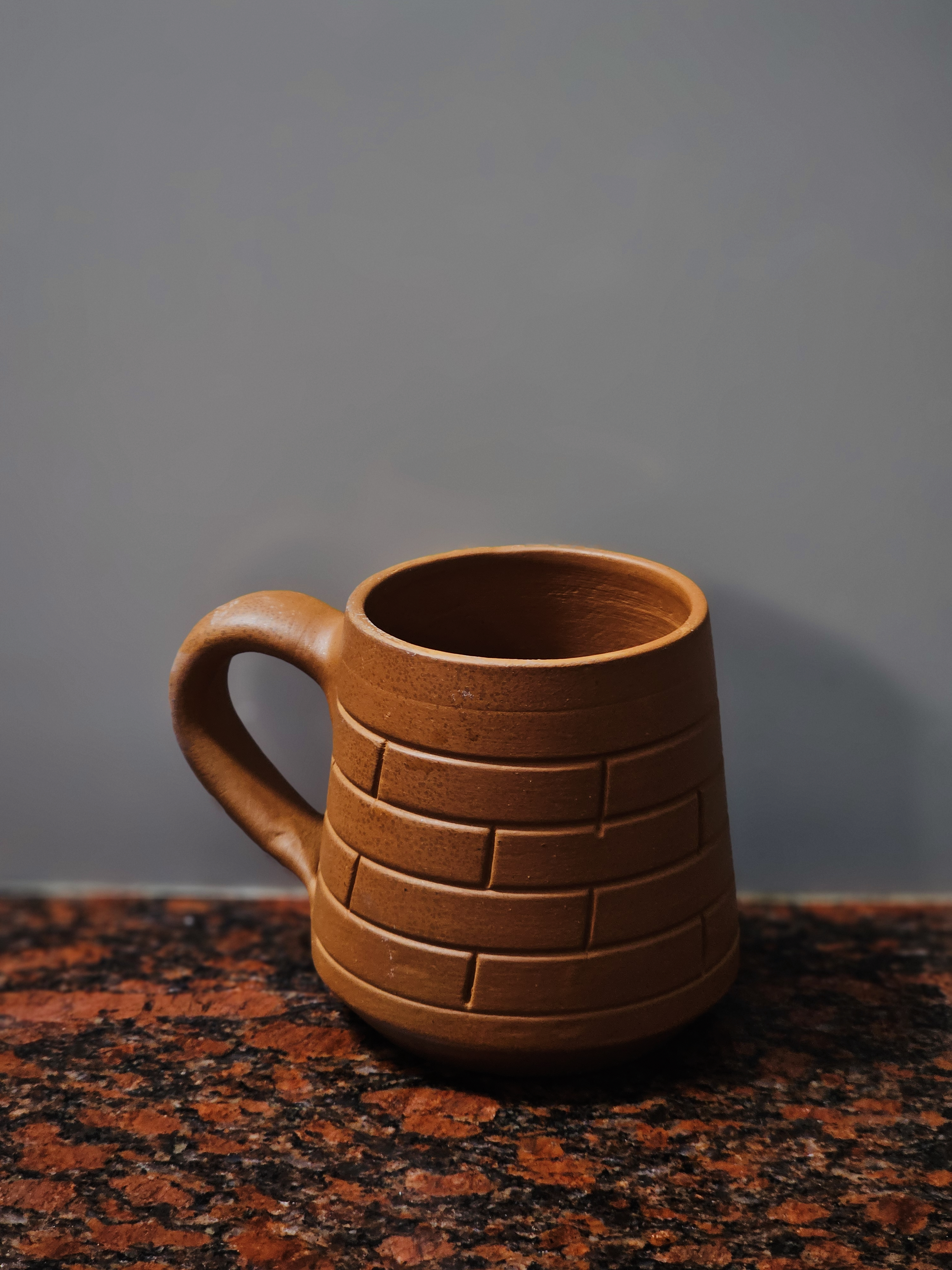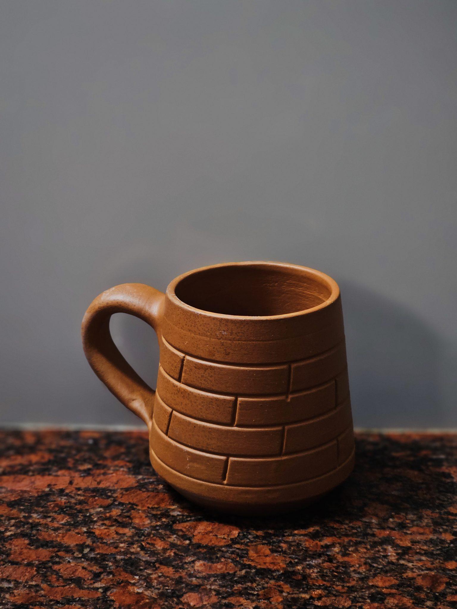Alternative Text: A handcrafted clay mug sits on a granite countertop in Perumanna, Kozhikode. The cup’s brick-style design and warm, earthy tone stand out beautifully against the plain background, giving it a simple and rustic look.