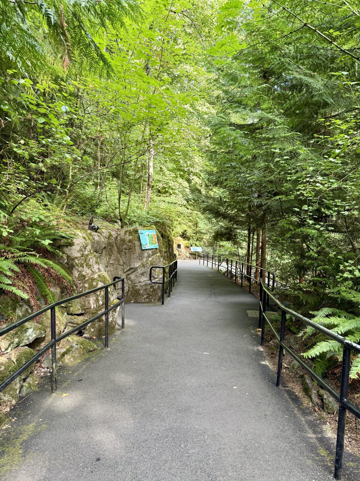Alternative Text: A quiet paved path winds through tall trees and ferns at the Oregon Zoo, Portland. Handrails and signs guide visitors through the lush greenery.