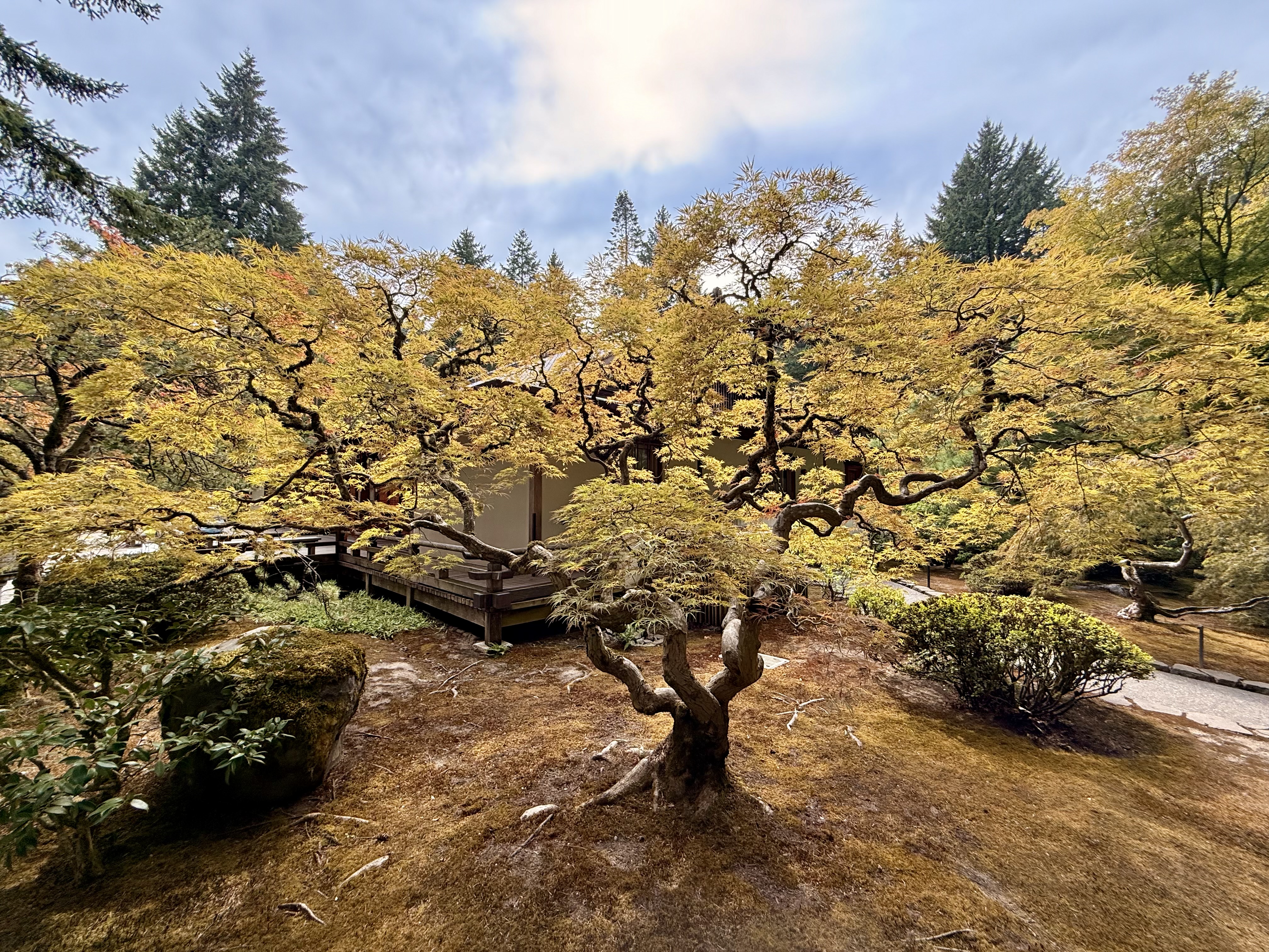 Alternative Text: A large Japanese maple tree with golden leaves and twisting branches spreads wide in the autumn light. Taken at Portland Japanese Garden, Oregon.