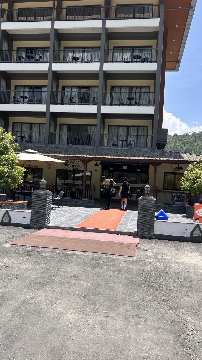 Alternative Text: A modern hotel building with multiple balconies and large windows is visible in the background.