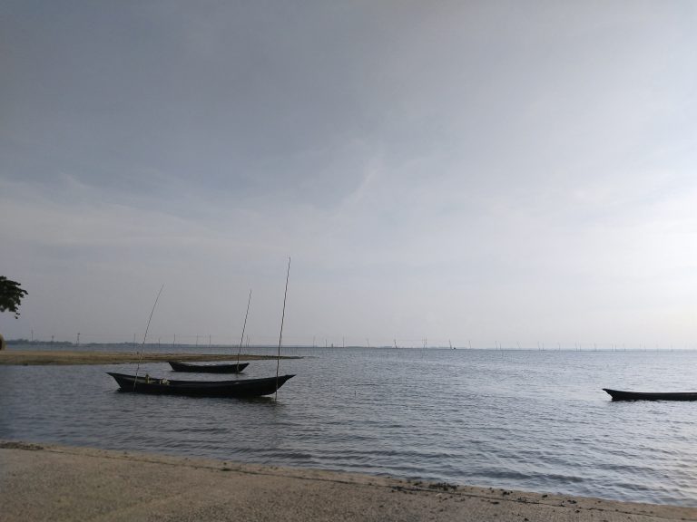 Alternative Text: Evening river scene with some small boats are floating.