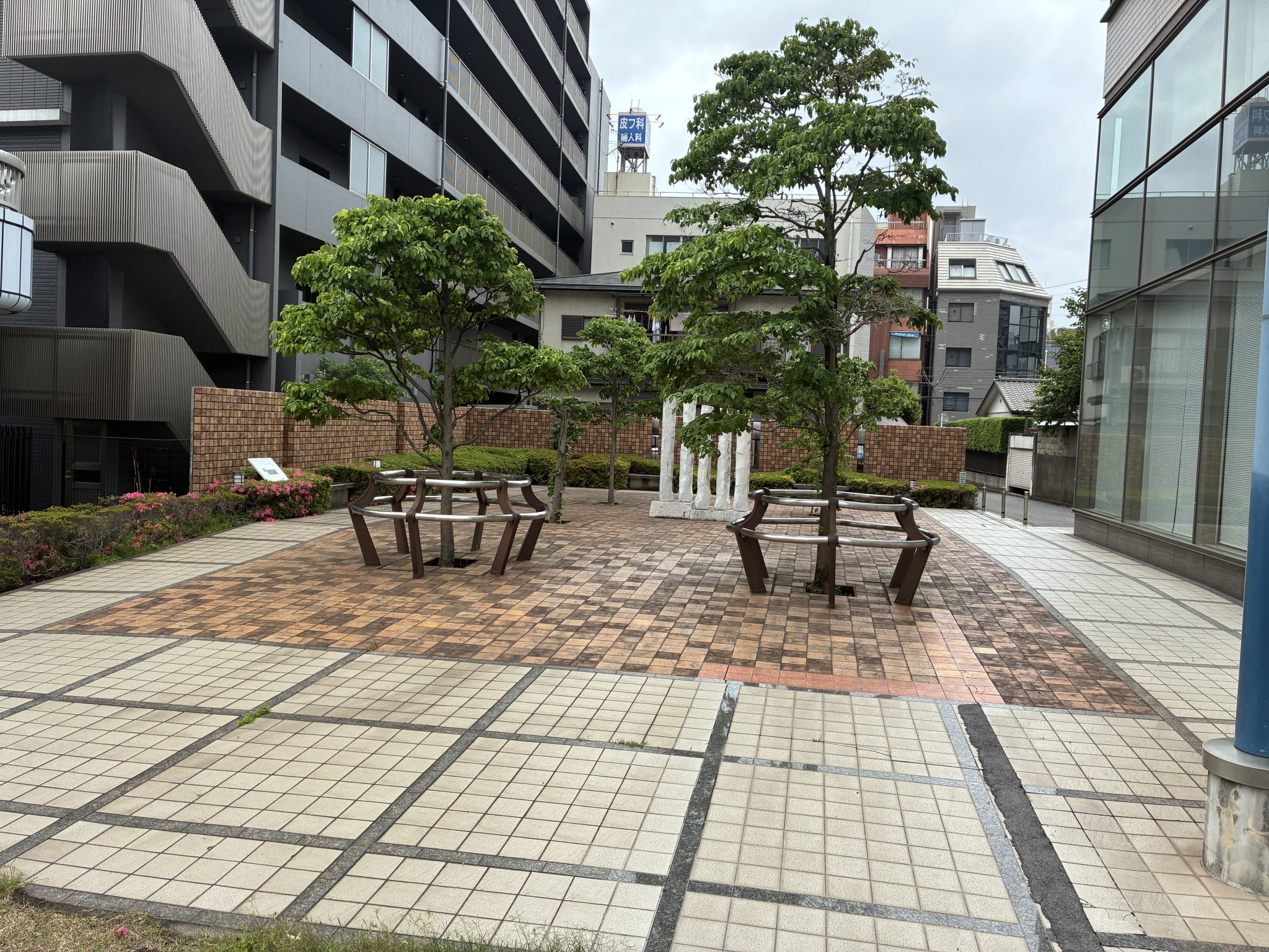 Alternative Text: A landscaped outdoor area featuring a paved patio with square tiles, surrounded by low shrubs and small trees. In the center, there are several wooden benches arranged in a circular pattern under the shade of trees.