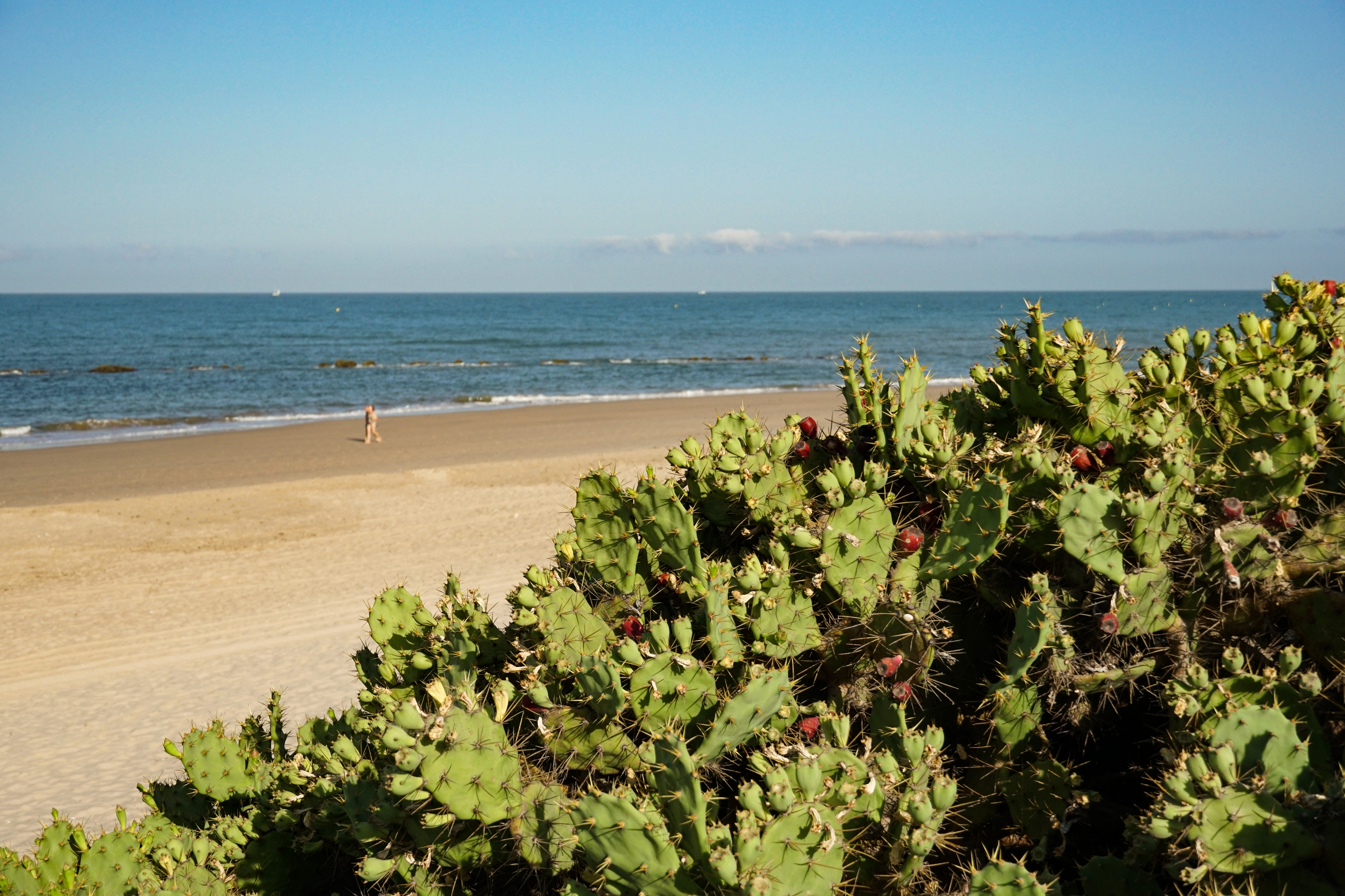 Alternative Text: A sandy beach stretches along the coastline under a clear blue sky, with calm waves gently lapping at the shore. In the foreground, a vibrant patch of prickly pear cactus, adorned with bright red fruit, adds greenery to the scene.