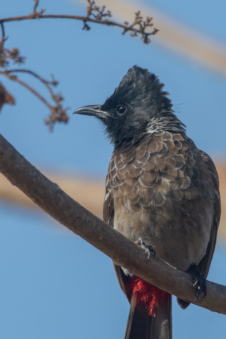 Alternative Text: A close-up of a Red-vented Bulbul perched on a branch.
