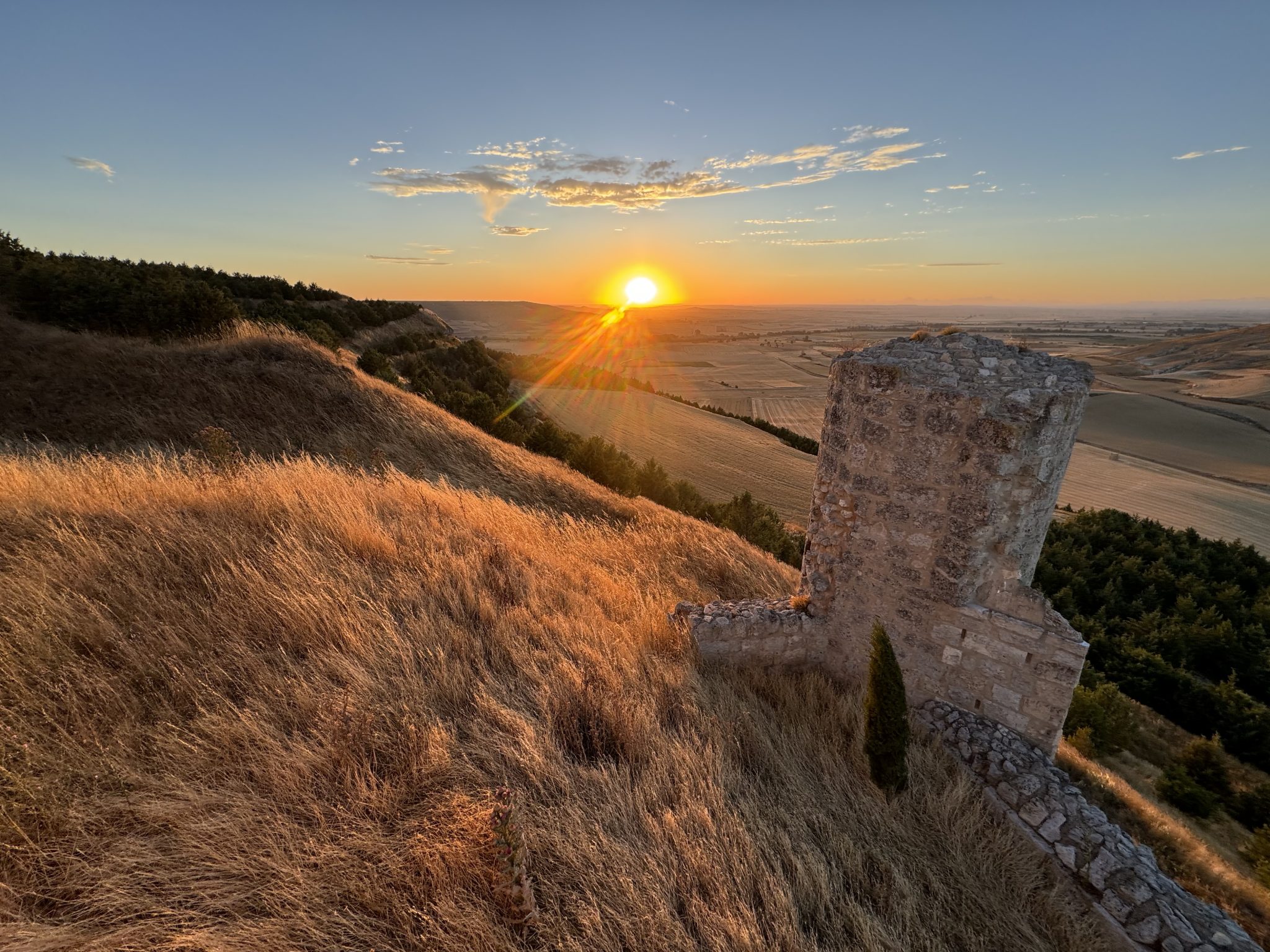 Alternative Text: Sunset over rolling fields in Castrojeriz (Burgos, Spain): a weathered stone tower stands on a grassy ridge. Golden light ignites the dry hillside, sunrays streak across the valley, and dark pines dot the slopes as distant plains fade beneath a blue-orange sky.