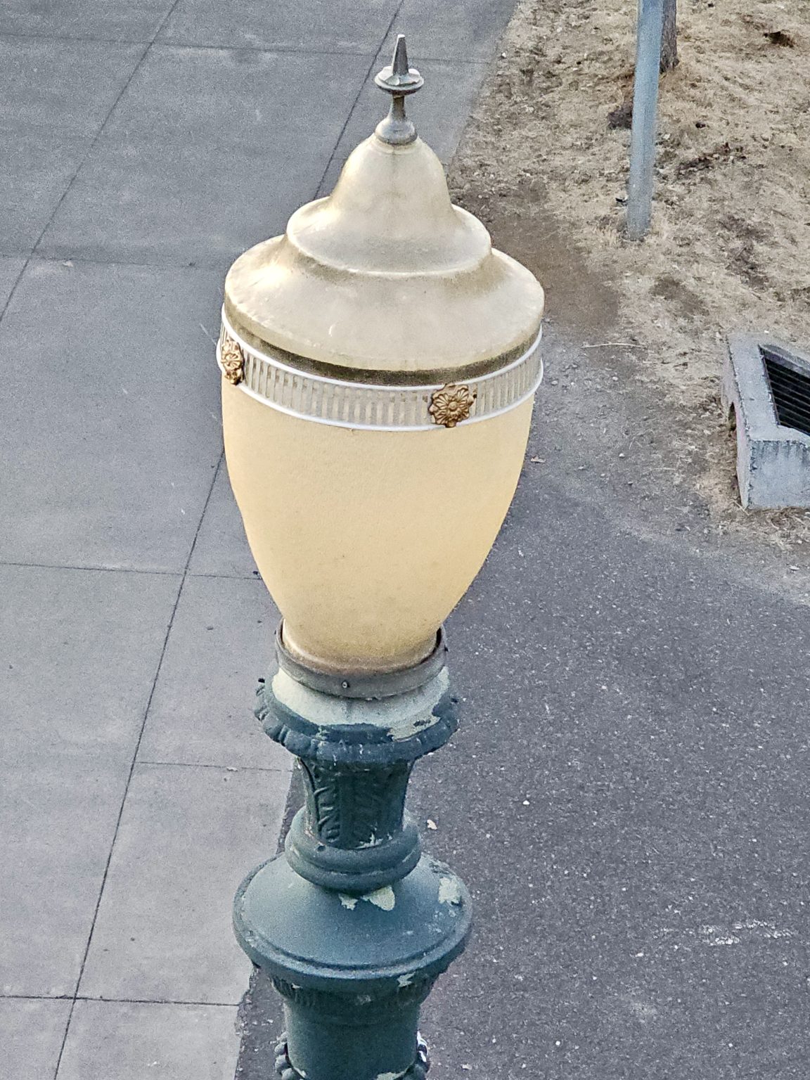 Alternative Text: A classic-style streetlamp with peeling paint seen near Tilikum Crossing Bridge in Portland. The design has a gold and green finish.