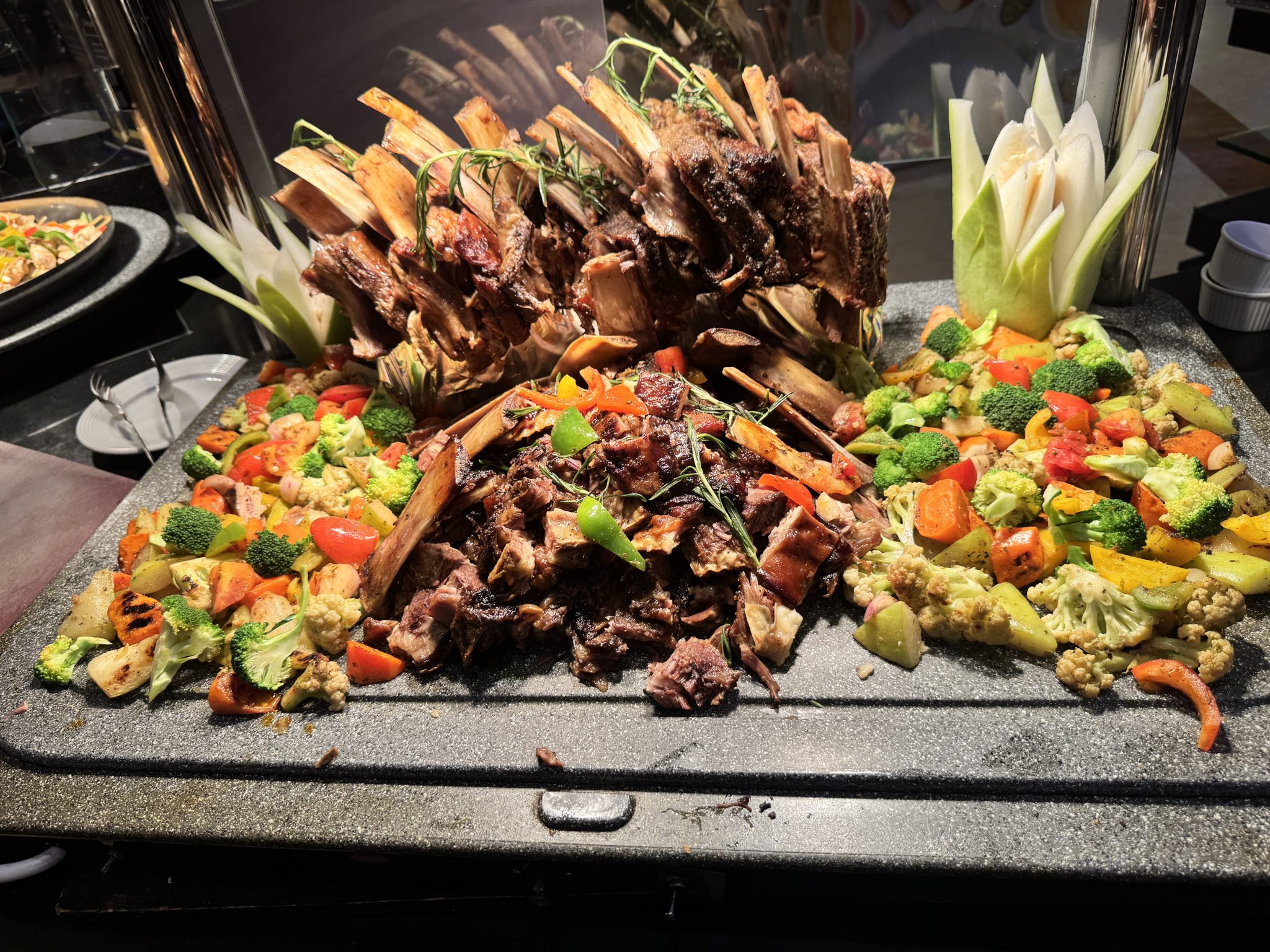 Alternative Text: An elaborate buffet display features a large roasted rack of mutton and chopped barbecue surrounded by a colorful medley of roasted vegetables.