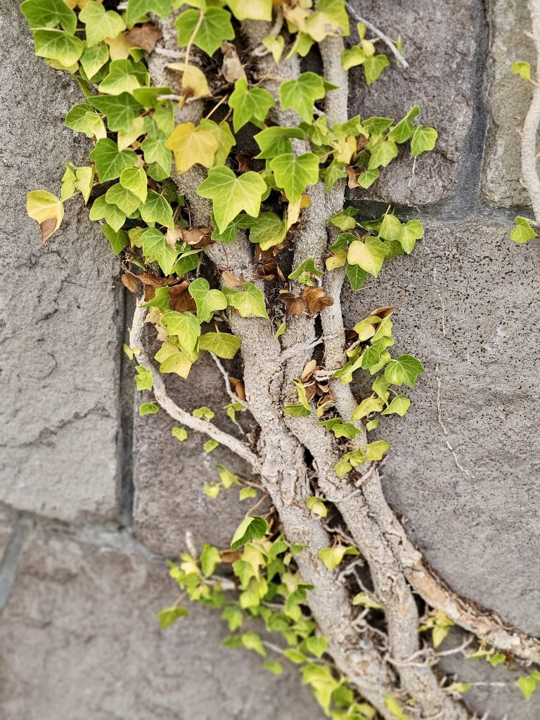 Alternative Text: Thick ivy vines grow across a stone wall with bright green leaves. Captured in Washington Park, Portland, during the evening.