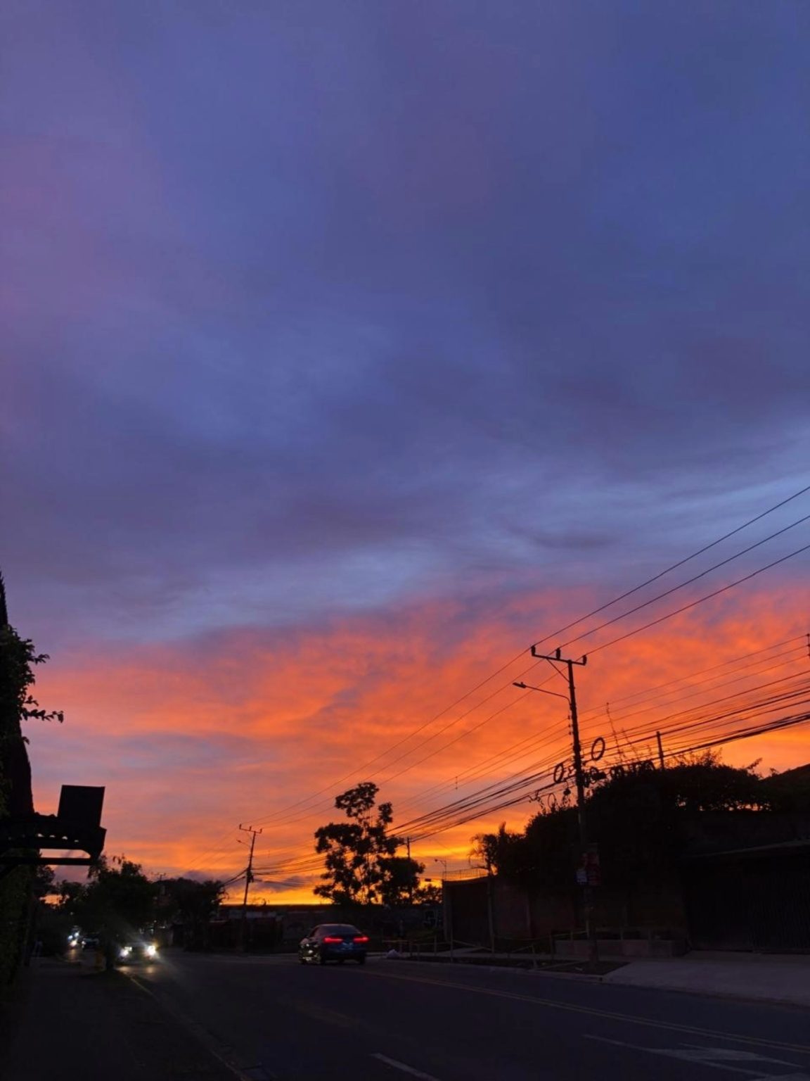 Alternative Text: Orange sunset view with cars passing by and trees in dark tones.