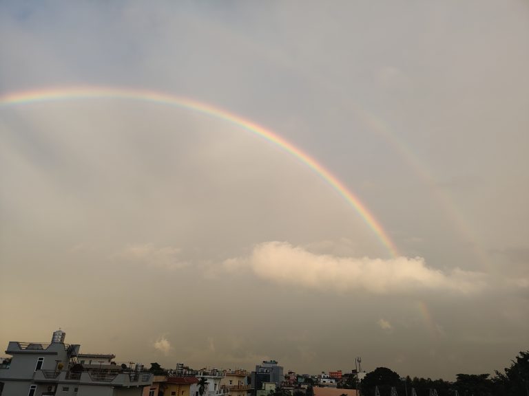 Alternative Text: A vibrant rainbow arcs across a cloudy sky, with a faint double rainbow visible above it.