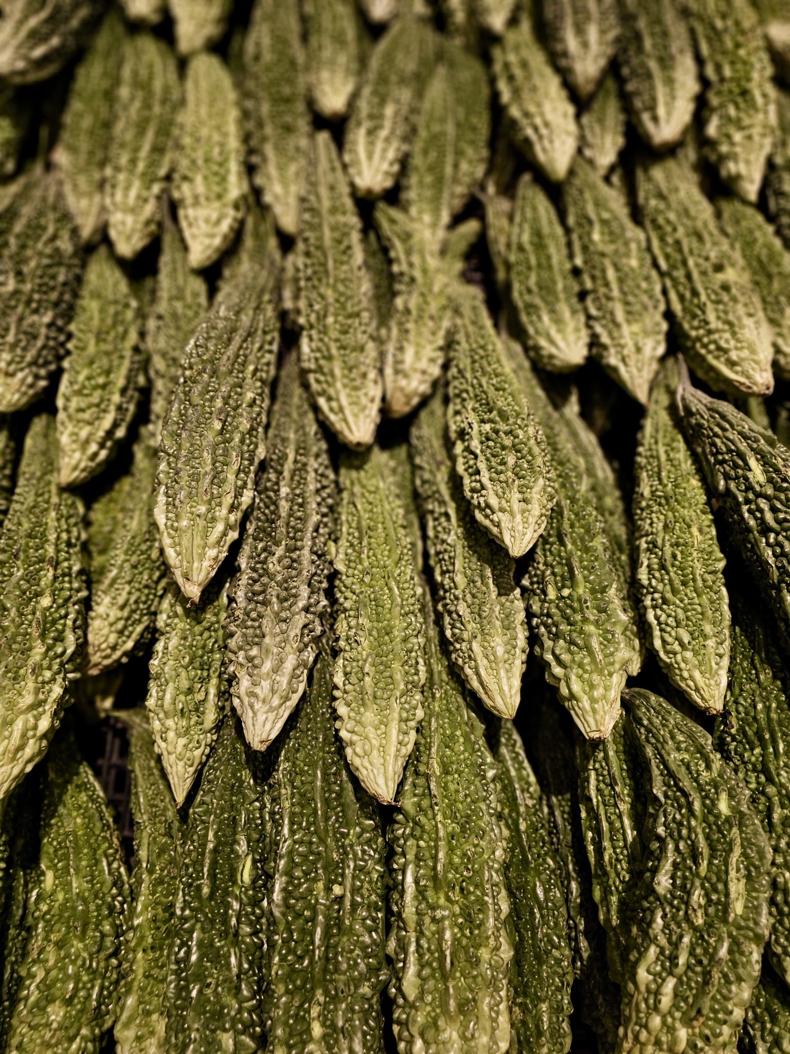 Alternative Text: Fresh bitter gourds neatly displayed with their rough, textured skin, captured at a hypermarket in Kozhikode, Kerala.