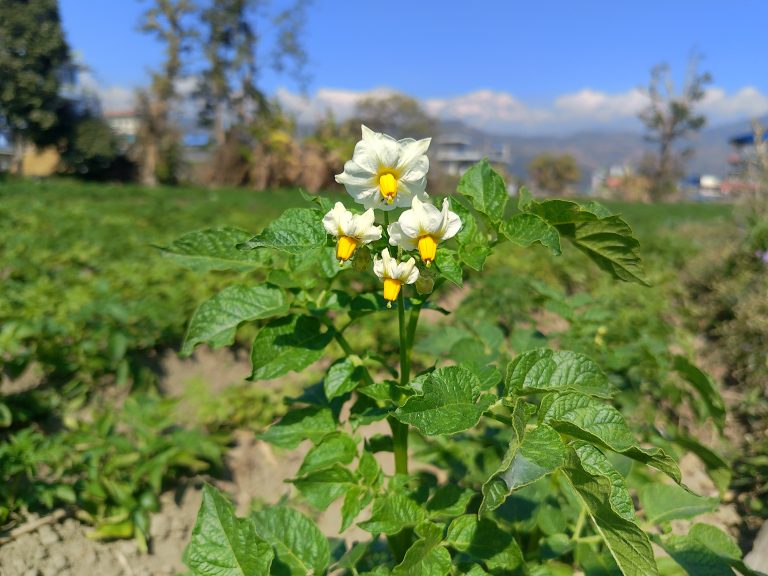 Alternative Text: A close-up view of a potato plant in bloom, featuring clusters of white flowers with yellow stamens.