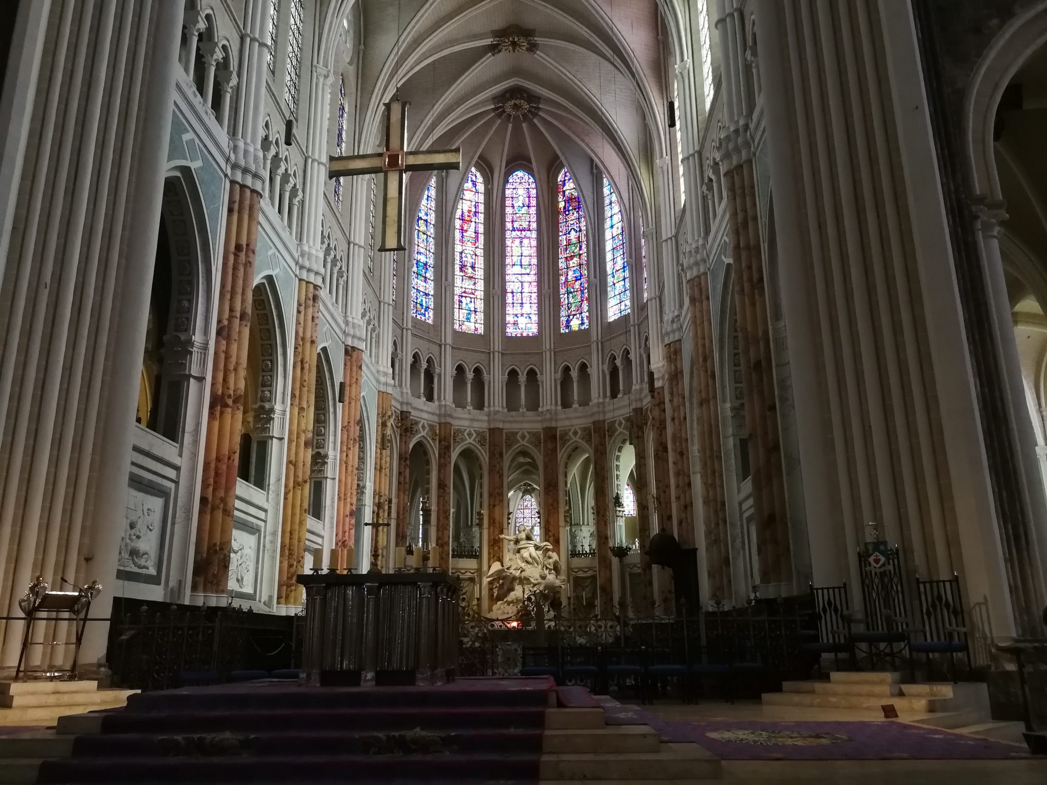 Alternative Text: an inside view of an church “cathedral of chartres” show the altar and statues
