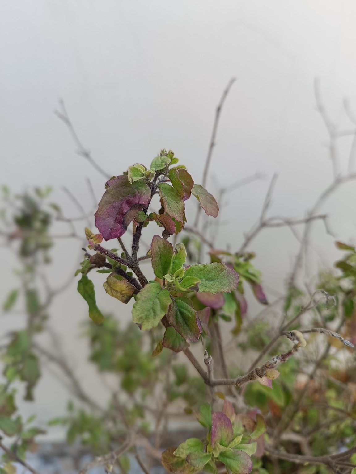 Alternative Text: View of basil leafs and strem against blurred background in a garden.