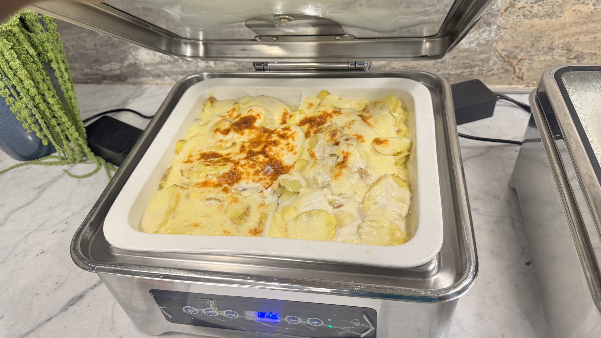 Alternative Text: An open buffet warmer contains a creamy, baked potato and egg gratin in a white sauce, with a browned and spiced topping.
