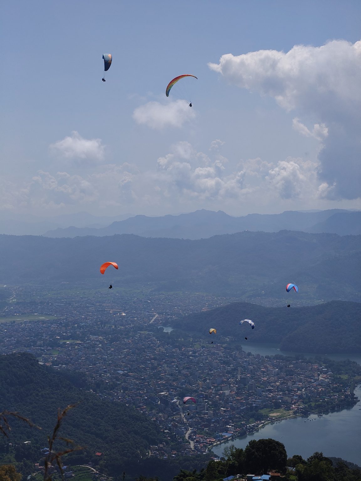 Alternative Text: A panoramic view from a mountain overlooking a town and lake below, with several colorful paragliders soaring in the sky.
