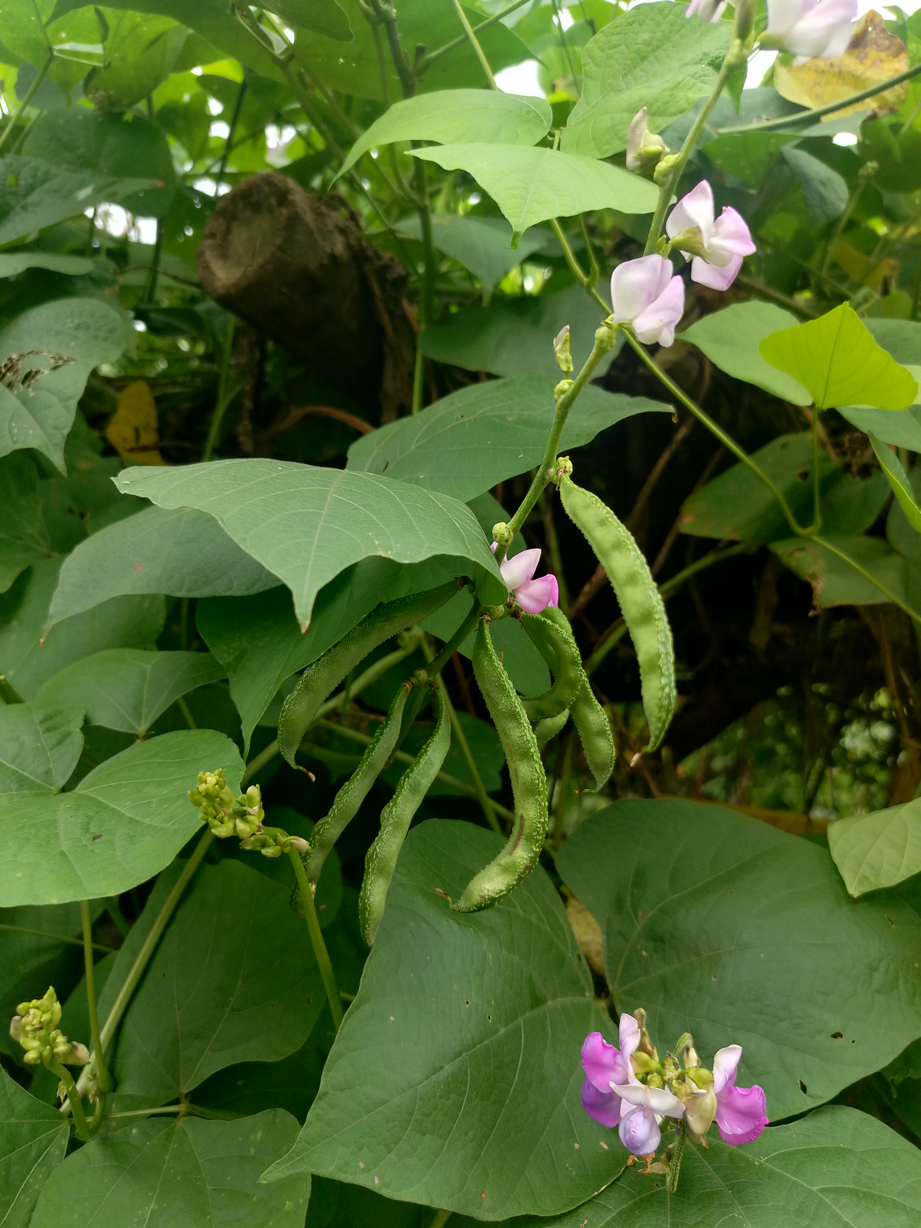 Alternative Text: A close-up of a leafy green plant with heart-shaped leaves, light pink flowers, and green seed pods in a lush setting.