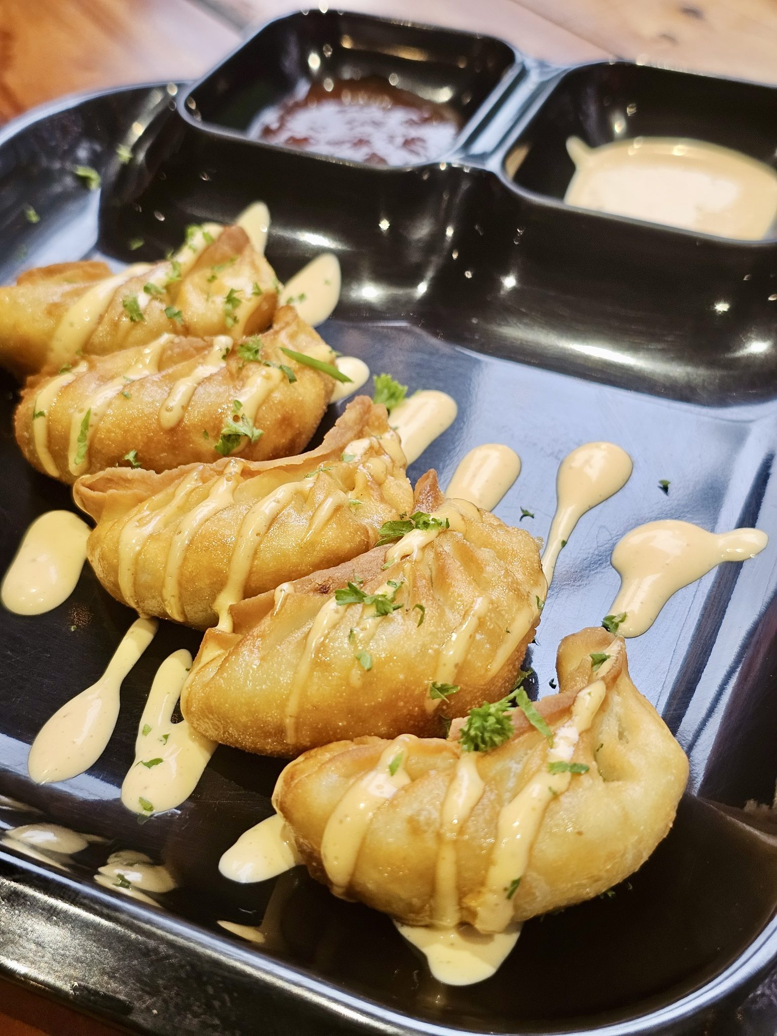 Alternative Text: A plate of golden fried momos topped with creamy sauce and garnished with herbs. Served with spicy dips, ready to enjoy. Captured in Oorkadavu, Kozhikode.