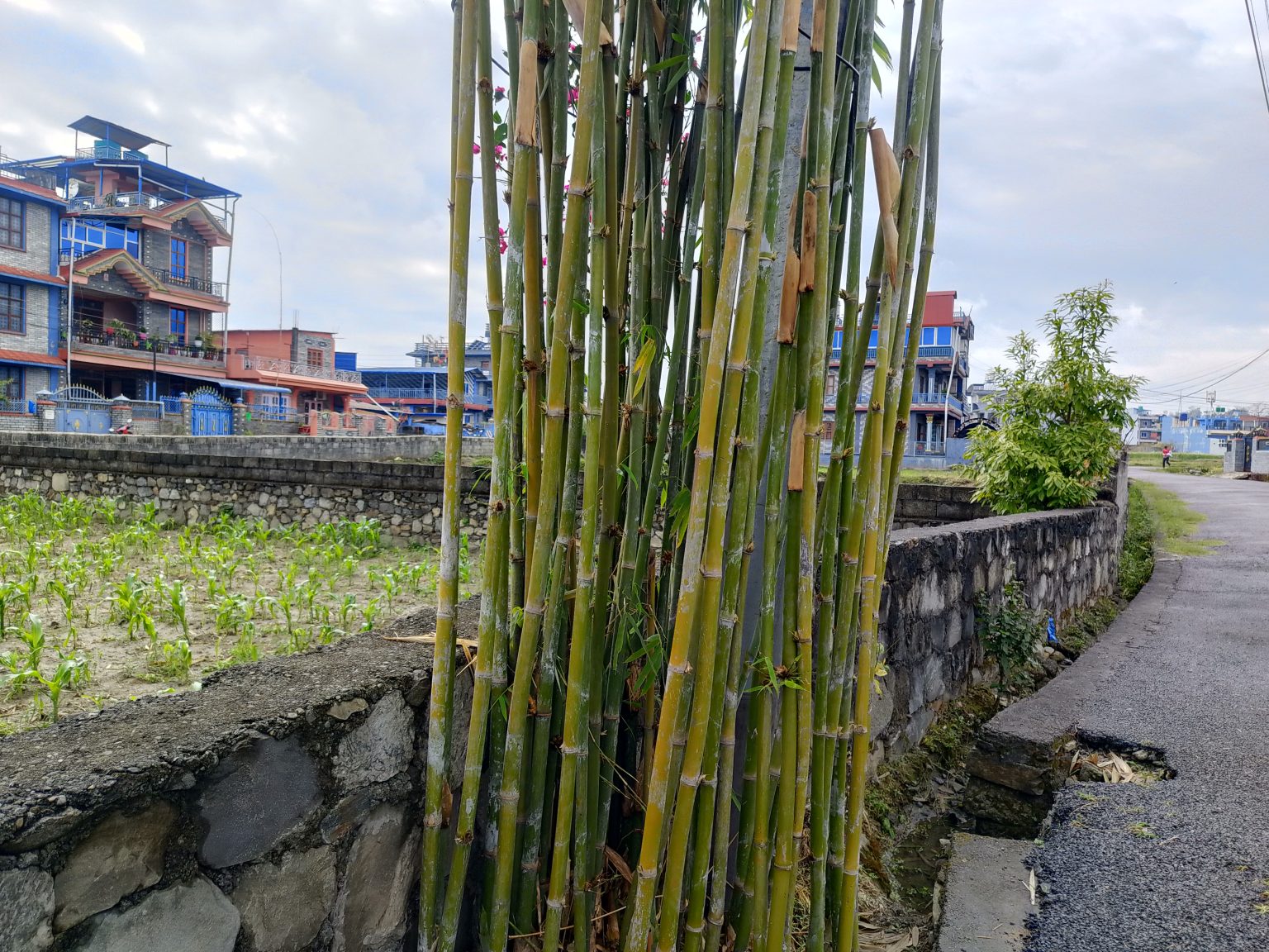 Alternative Text: A cluster of tall green bamboo stalks beside a stone wall along a roadside, with houses and a cloudy sky in the background.