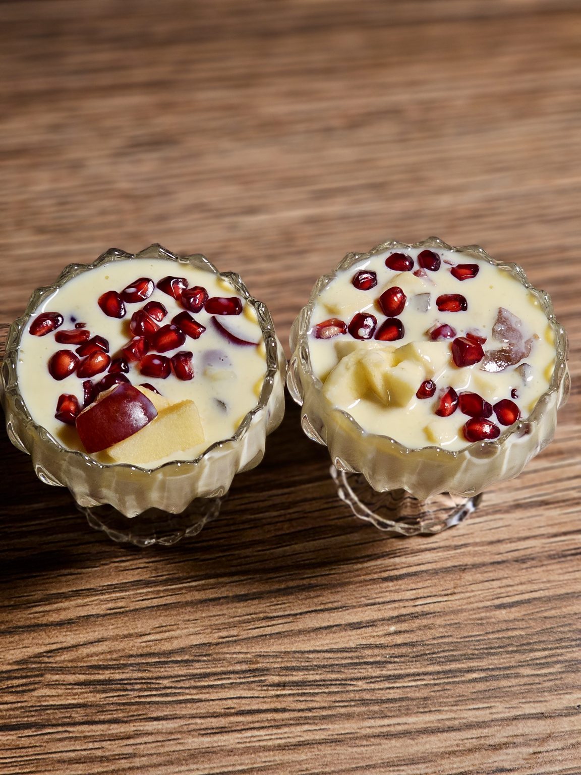 Alternative Text: Two small glass bowls filled with creamy fruit custard, topped with pomegranate seeds and fruit pieces, are placed on a wooden table in Perumanna, Kozhikode.