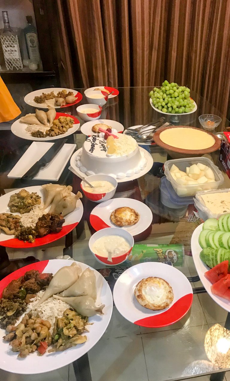 Alternative Text: A glass table is set with a white birthday cake, several plates of savory food including momo or dumplings, fruits, and desserts.