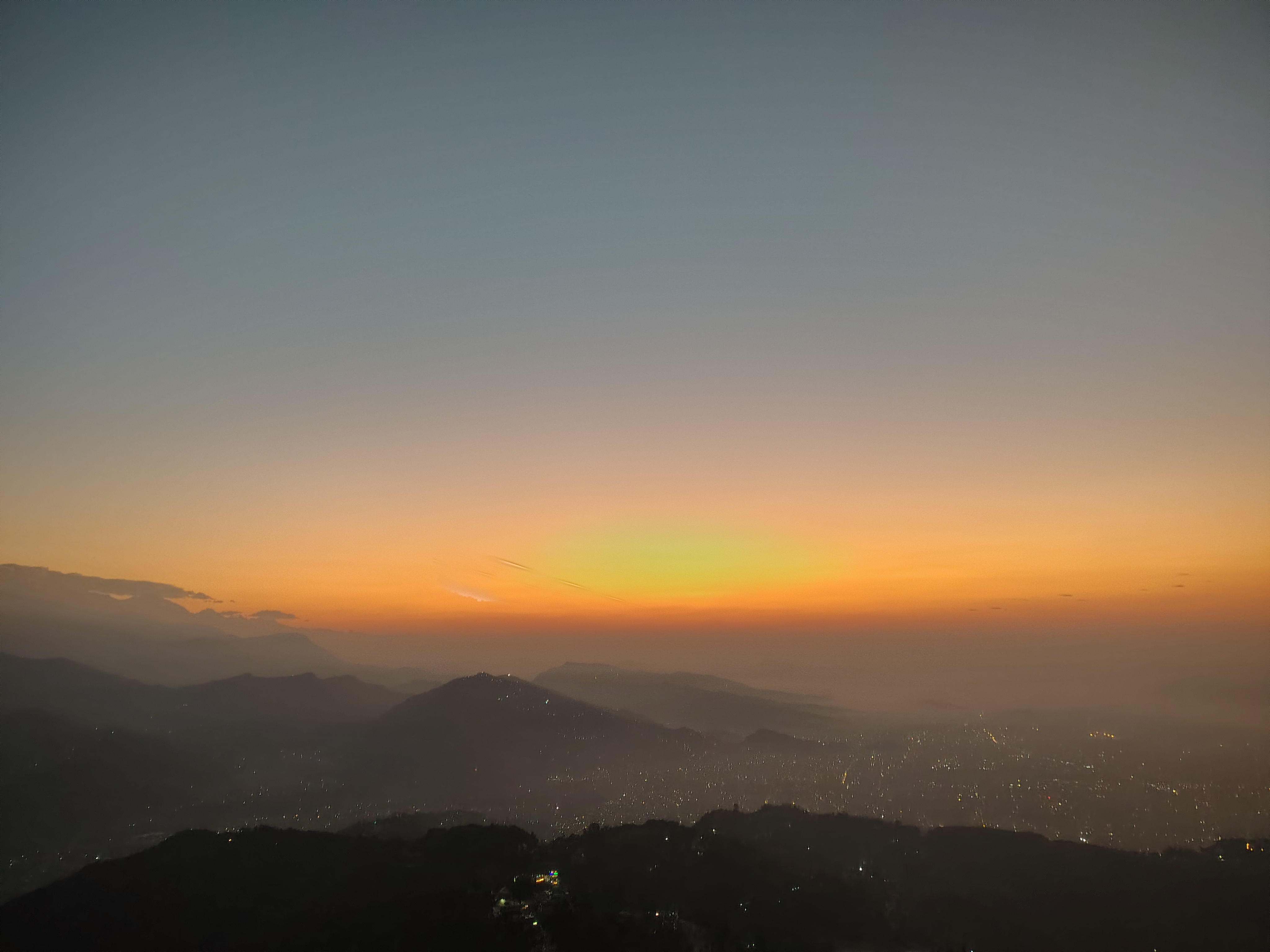 Alternative Text: A panoramic view of a sunset over a mountainous landscape. The sky is painted in gradient hues of orange, pink, and blue, transitioning from the warm colors of sunset to the cooler tones of twilight.