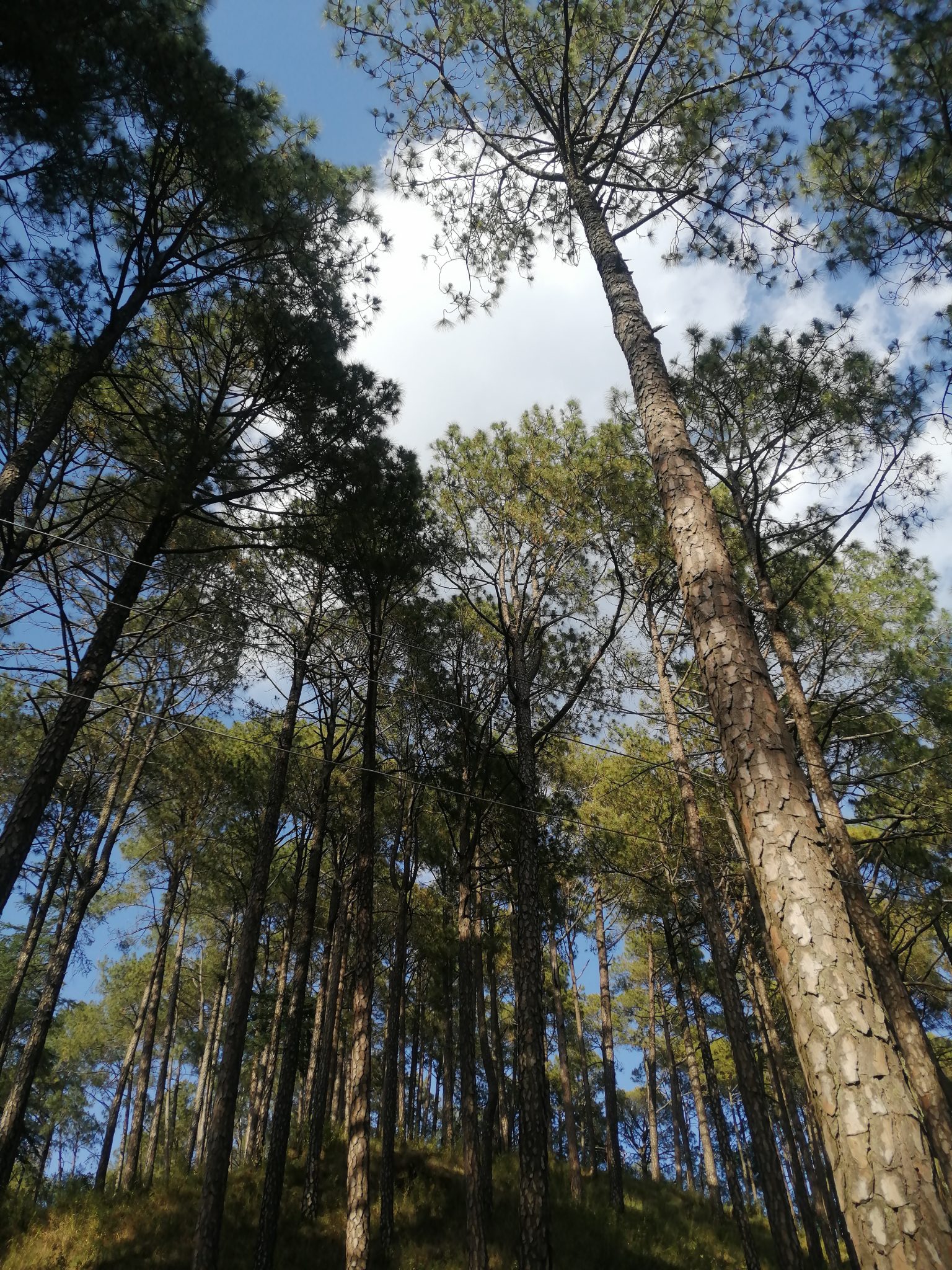 Alternative Text: A shot taken by poinitng the camera up and taking the photo of huge pine trees with white cloud in the sky caught between top of those trees.