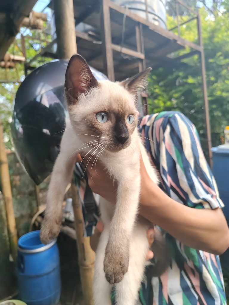 Alternative Text: A person holds a light-colored cat with brown markings, featuring striking blue eyes.
