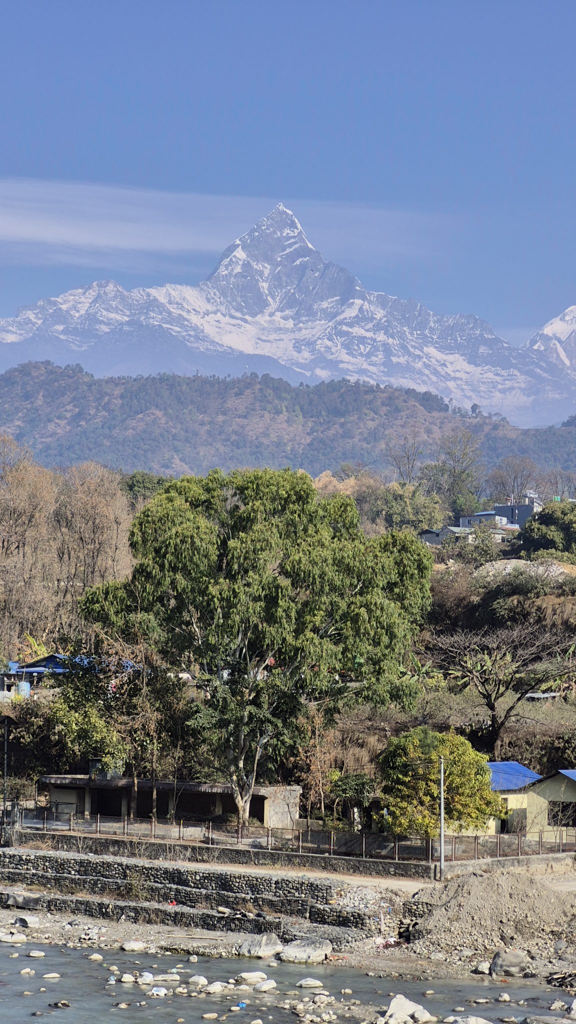 Alternative Text: A scenic view of a snow-capped mountain peak rising majestically against a clear blue sky. In the foreground, a lush green tree stands near a riverbed made up of smooth stones.