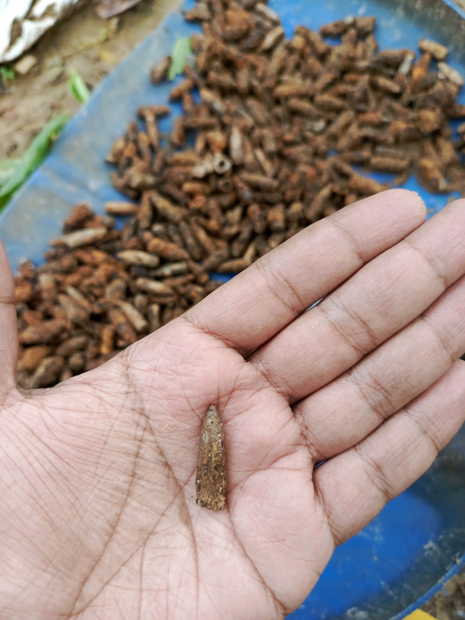 Alternative Text: A close-up of a person’s hand holding a small rusted bullet. In the background, there is a blue surface covered with numerous others.