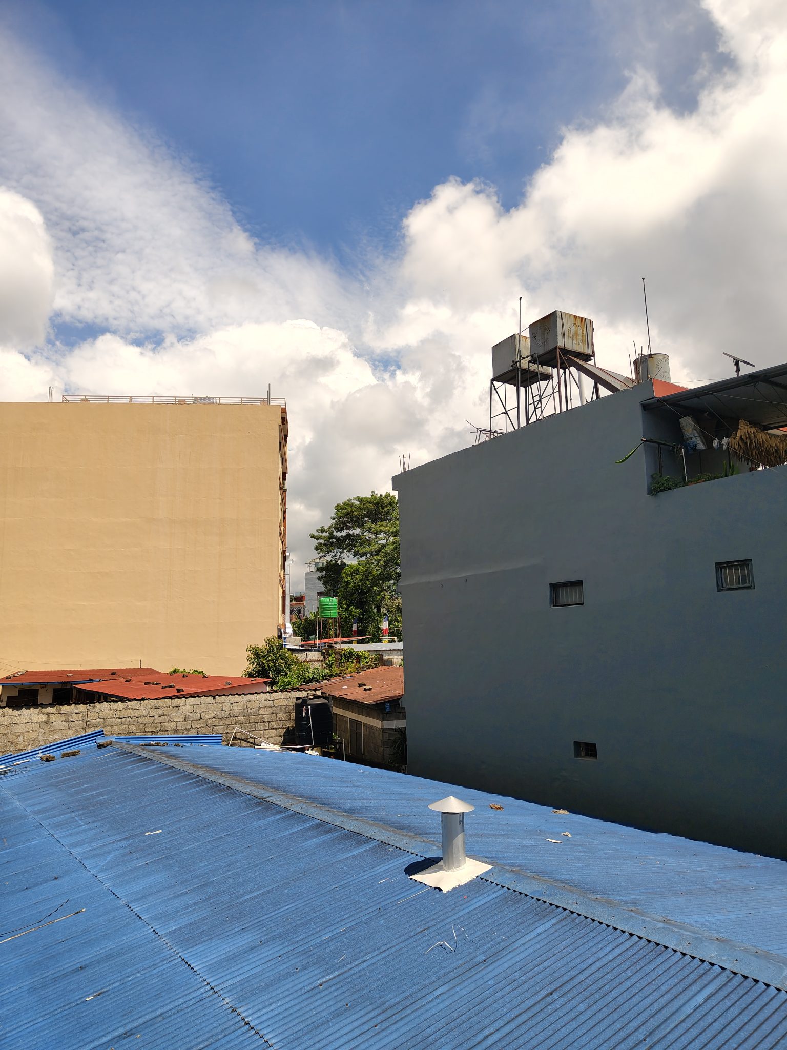 Alternative Text: A view of urban rooftops with a blue corrugated roof in the foreground. In the background, two buildings are visible: one is a plain beige wall and the other is a light gray structure with windows.
