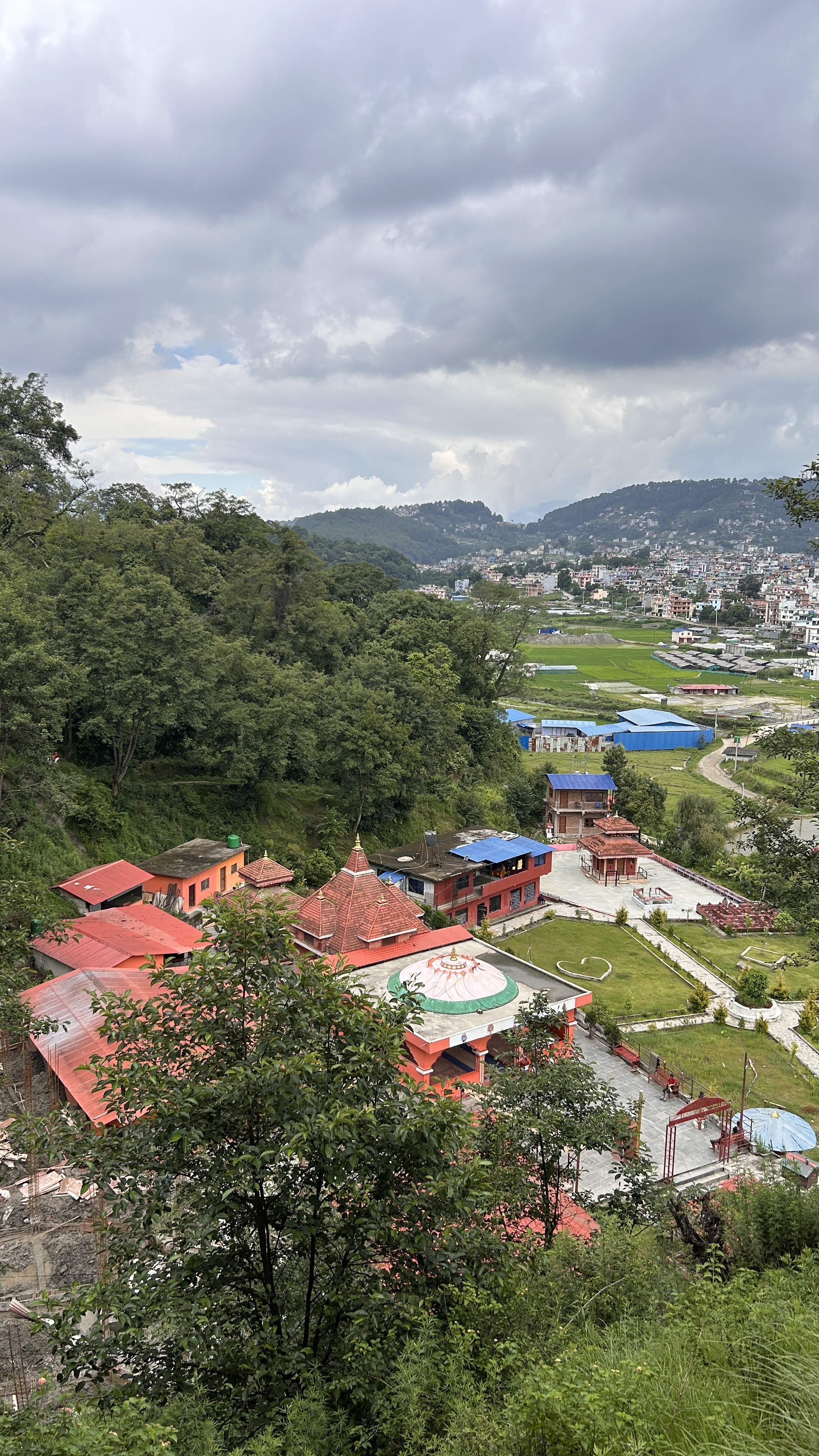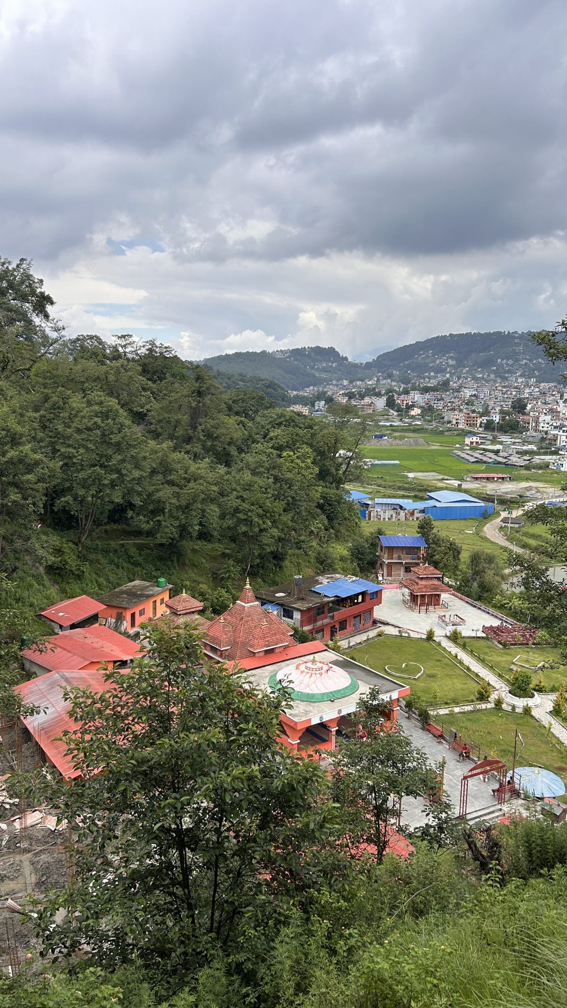 Alternative Text: A scenic view of a hilly landscape featuring a cluster of buildings with red rooftops nestled among lush green trees.