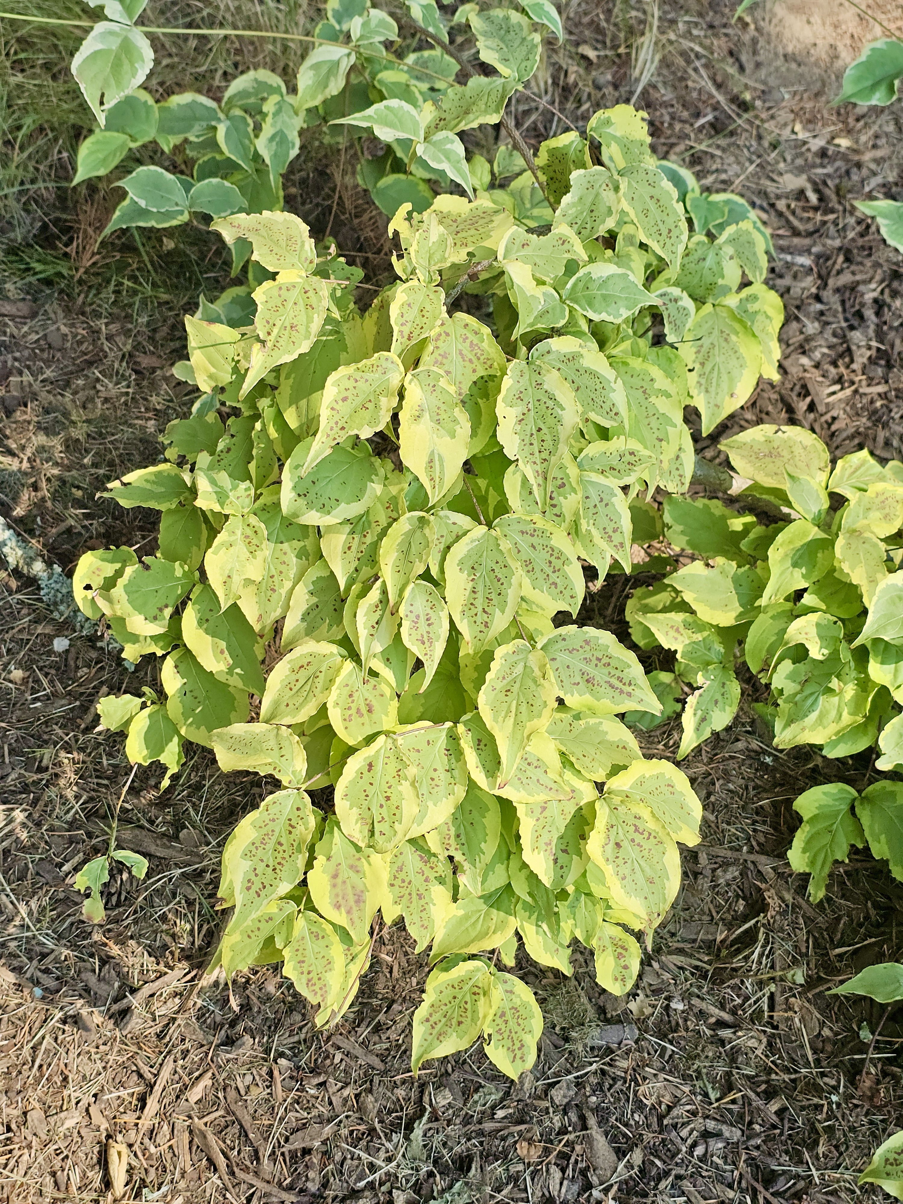 Alternative Text: A leafy shrub with yellow-green leaves covered in small reddish spots, growing in Hoyt Arboretum, Washington Park, Portland.