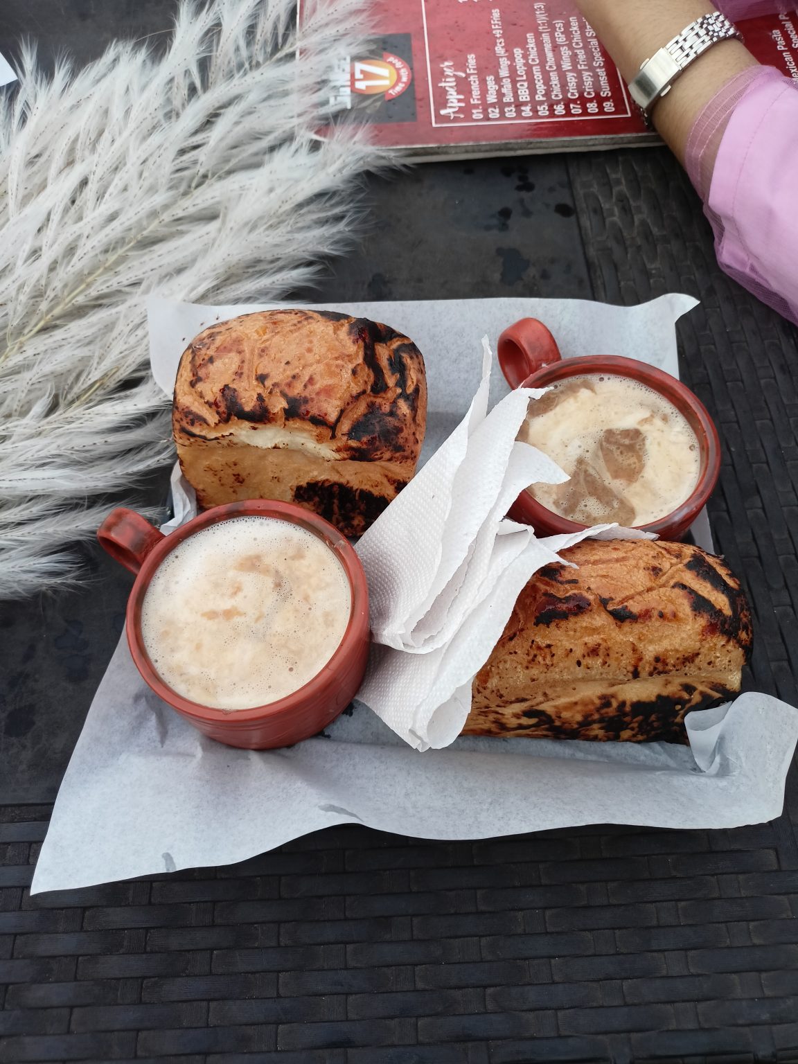 Alternative Text: A wooden serving tray holds two small circular cups filled with a frothy beverage, possibly coffee, alongside a piece of toasted bread with a charred crust