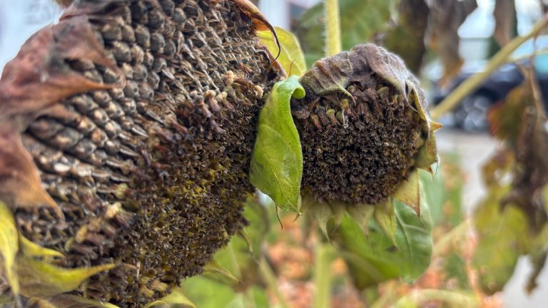 Alternative Text: Closeup of the center of a sunflower in the autumn after frost has ravaged the flower.