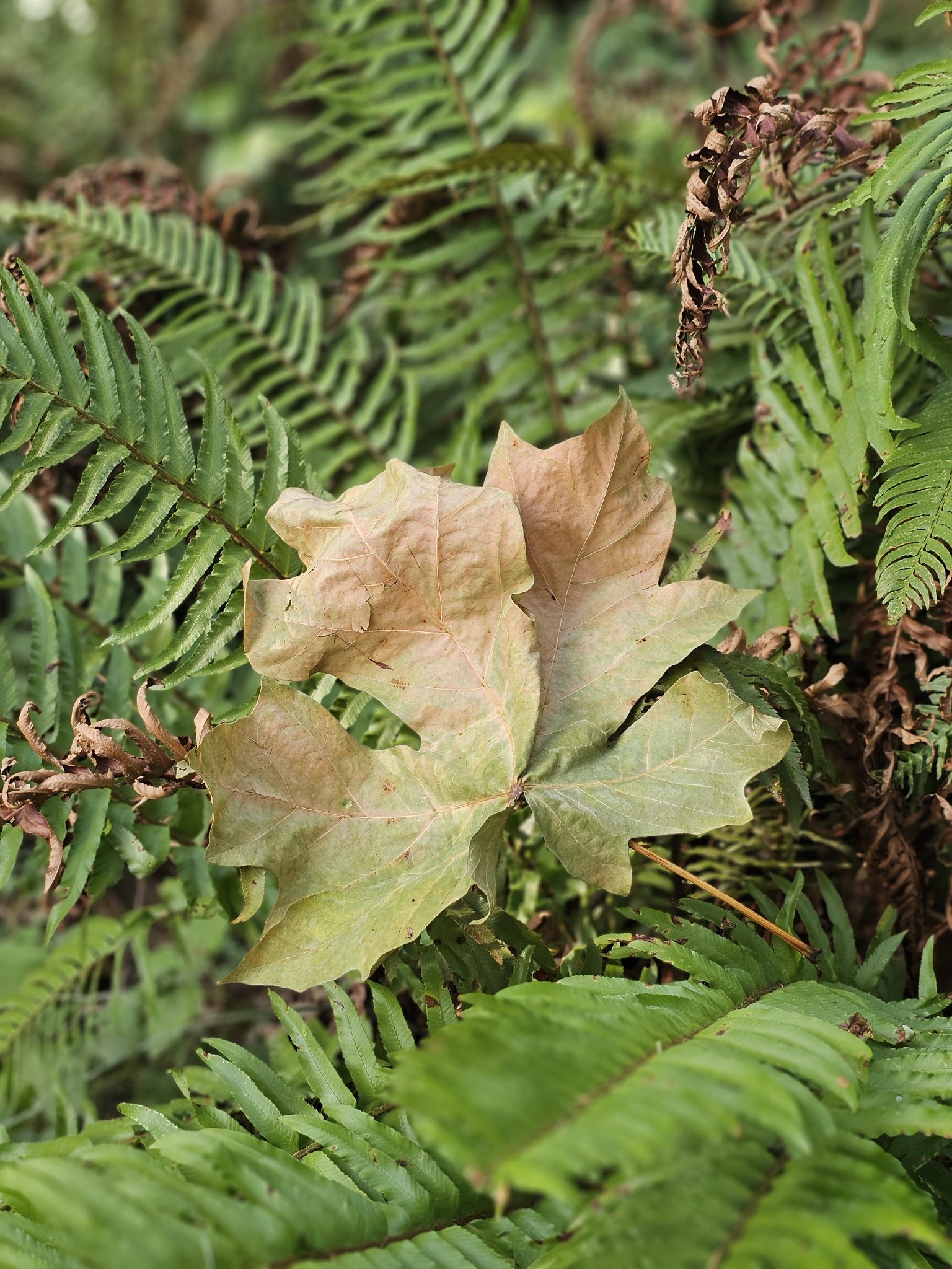 Alternative Text: A large, dry maple leaf resting on a bed of green sword ferns in Hoyt Arboretum, Washington Park, Portland.