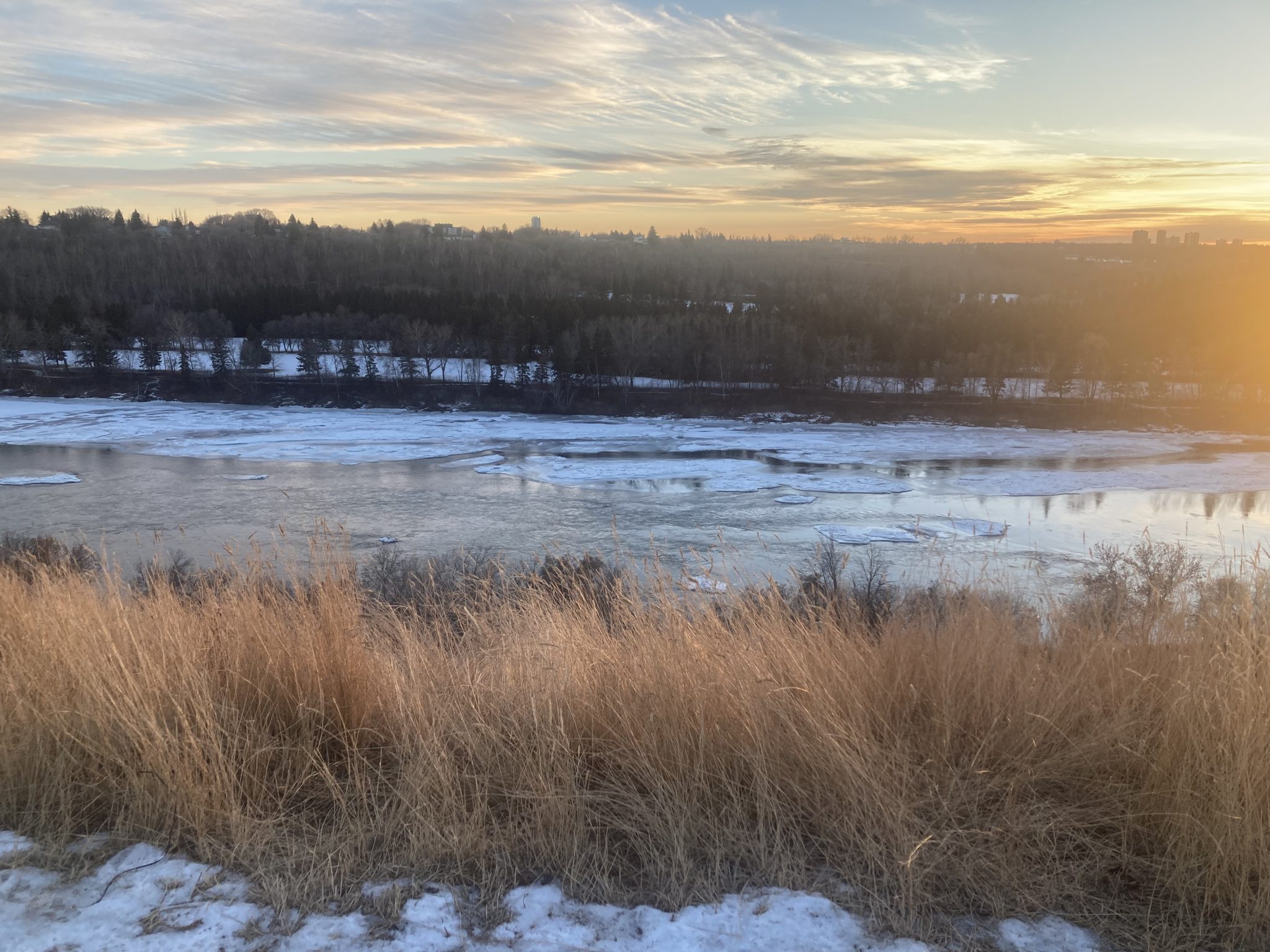 Alternative Text: North Saskatchewan River and Edmonton evening skyline in winter.