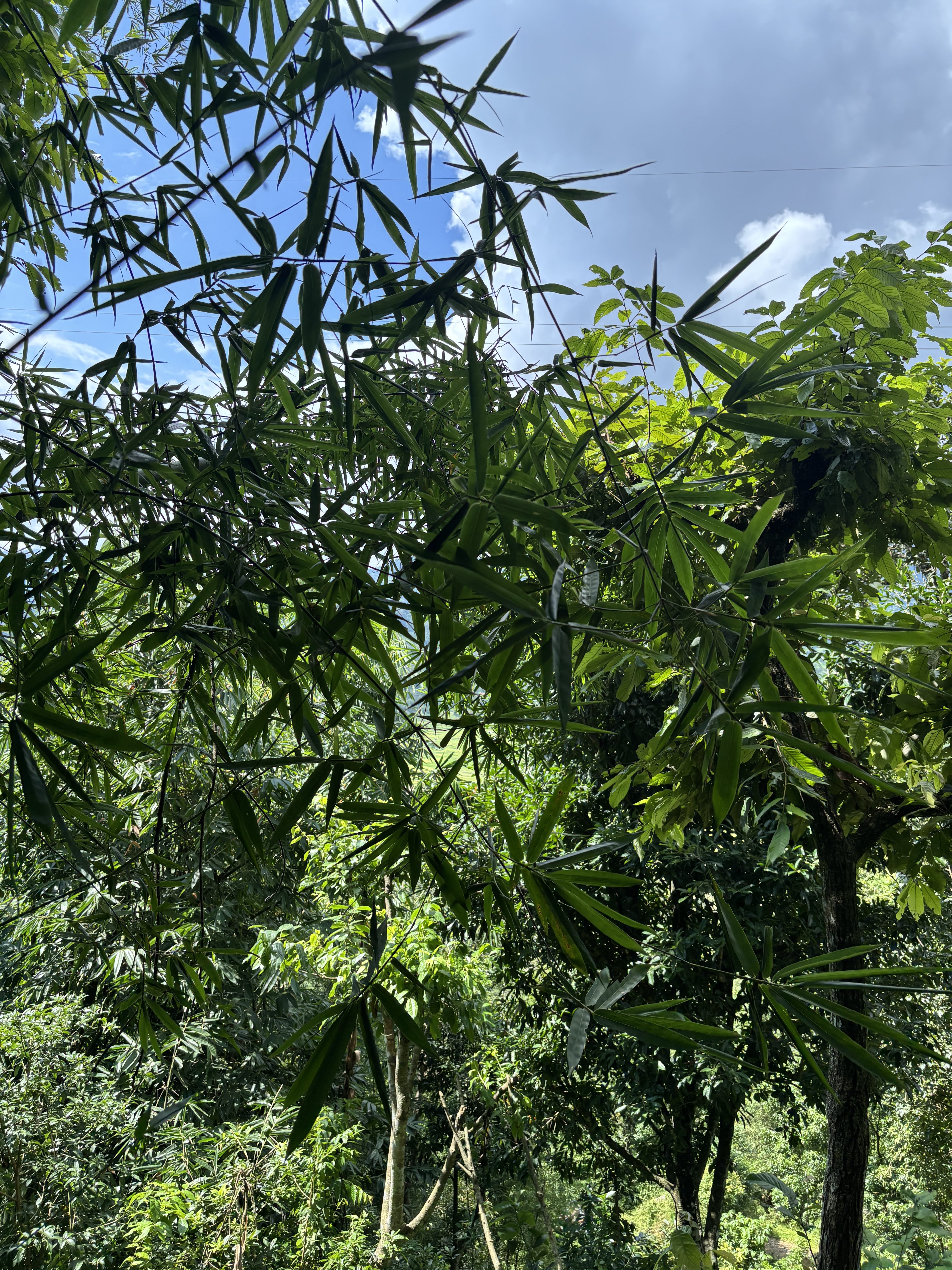 Alternative Text: A vibrant canopy of green leaves and bamboo foliage, with sunlight filtering through against a blue, cloud-streaked sky.
