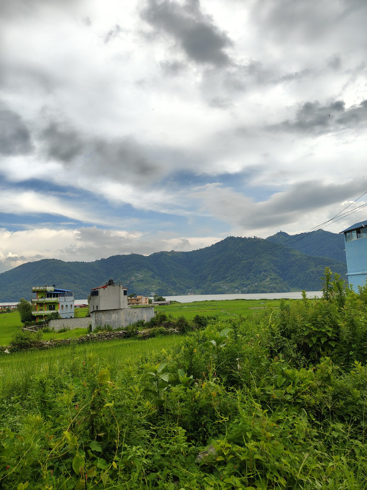 Alternative Text: A calm lake reflects the sky, with a few houses nestled along its edge. Green hills rise beside the lake, and lush grassy land surrounds the area, creating a serene and picturesque landscape.