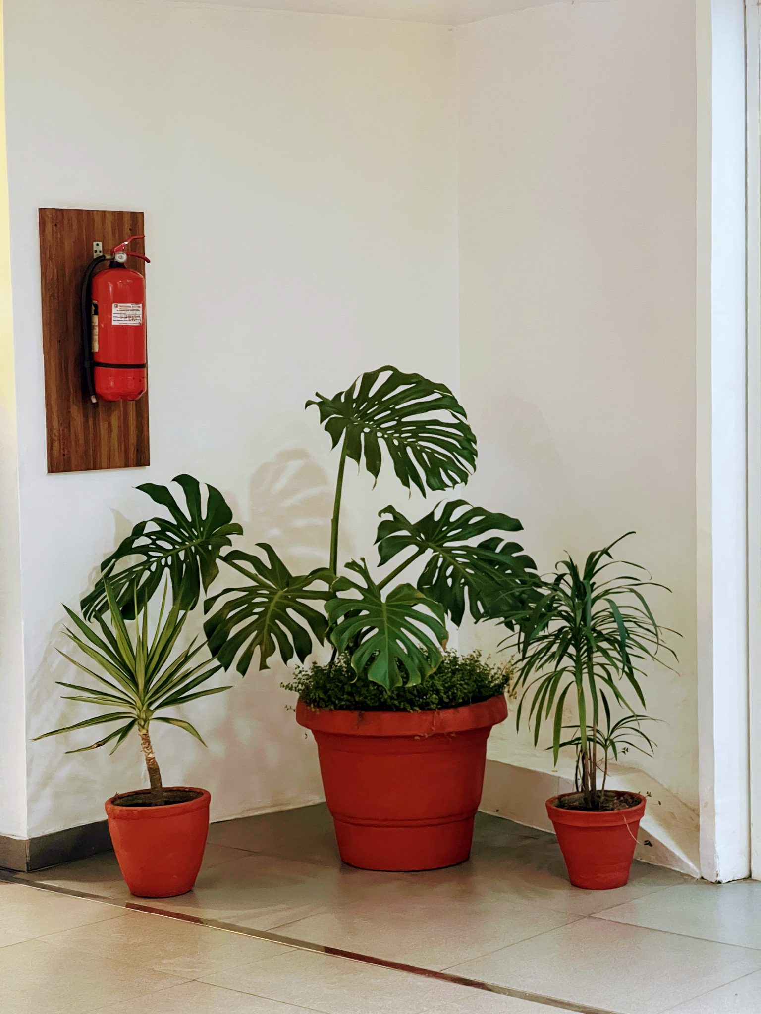 Alternative Text: A grouping of three potted plants – a large Monstera in the center and two smaller plants on the sides – stands in a corner beneath a red fire extinguisher mounted on a wooden plaque.
