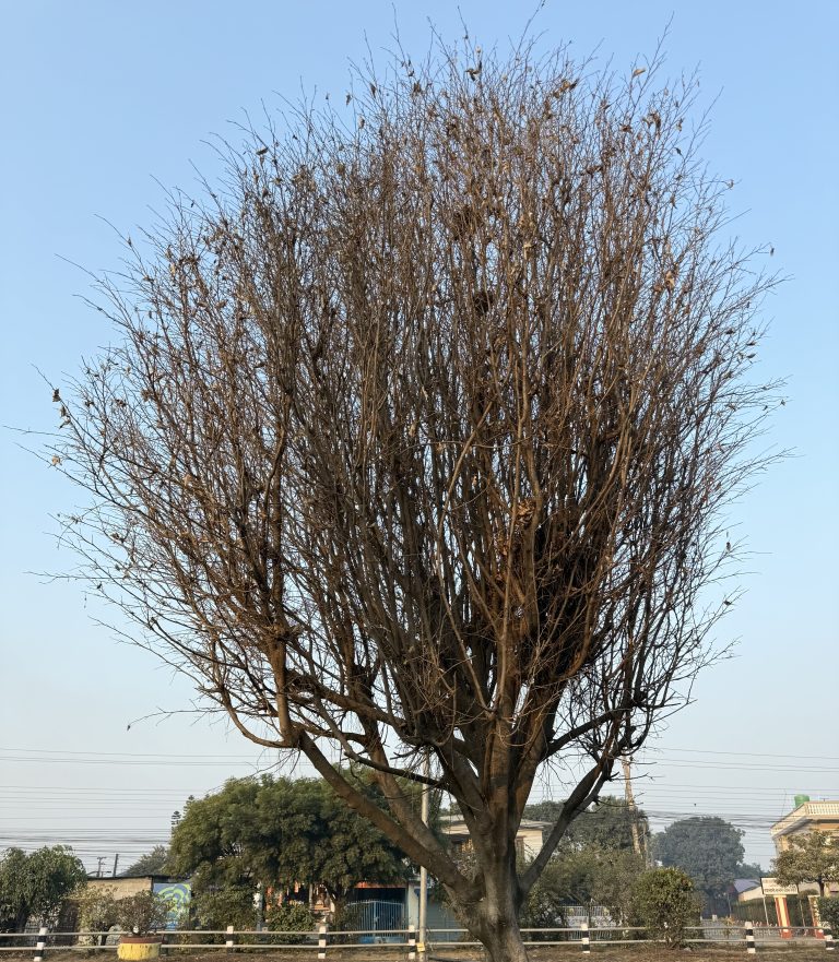 Alternative Text: A tall, leafless tree with a dense, twiggy crown against a clear blue sky.