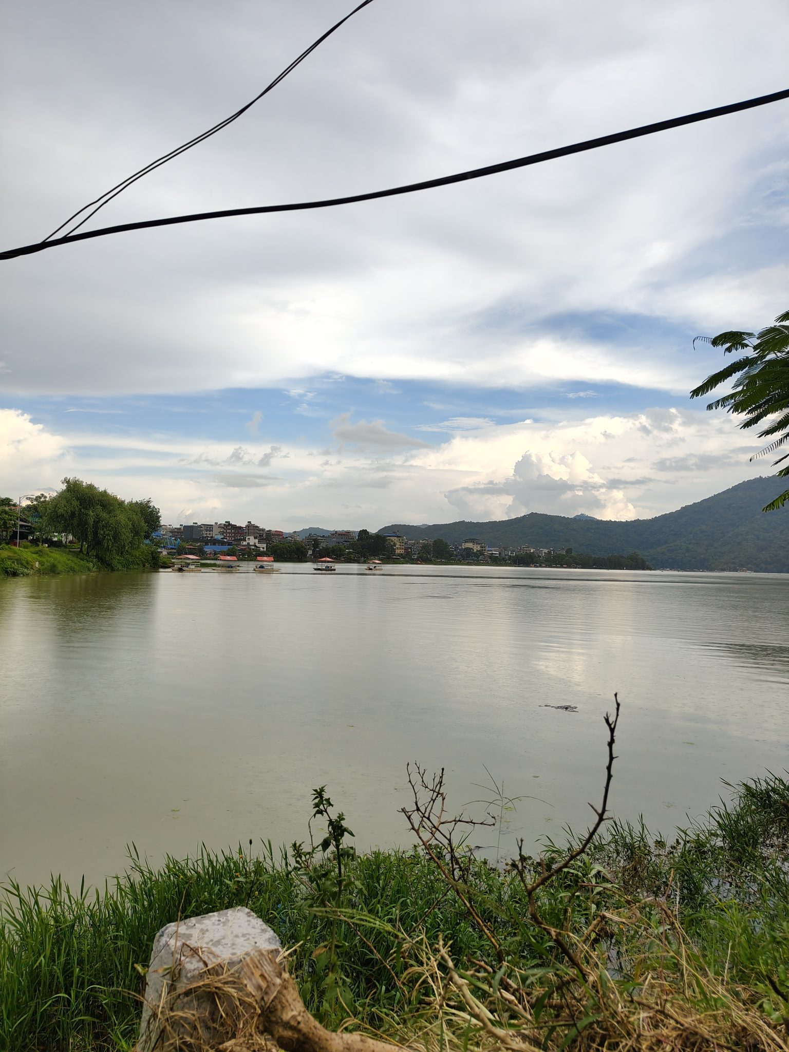 Alternative Text: A serene lakeside scene featuring calm water reflecting a cloudy sky with patches of blue
