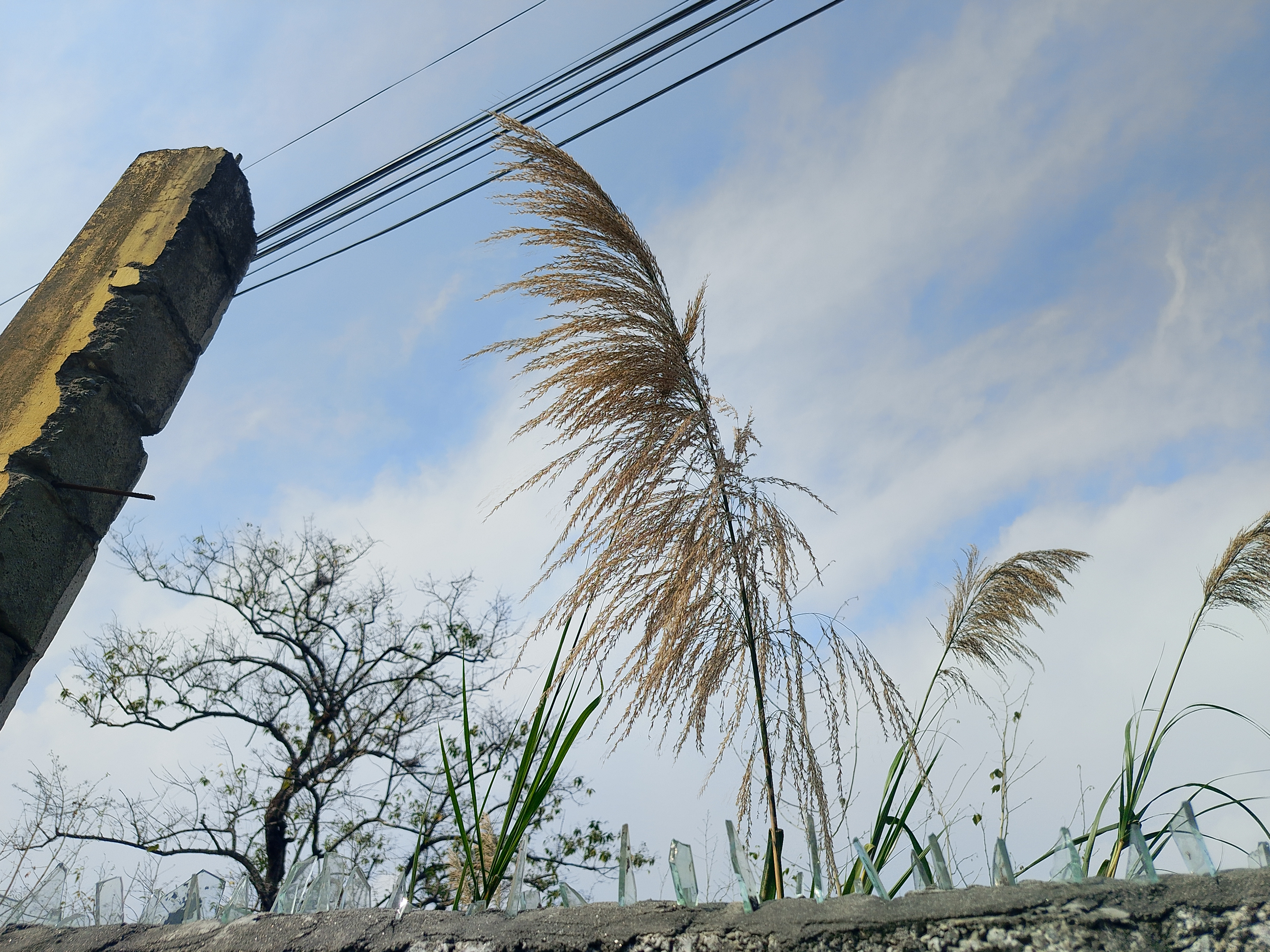 Alternative Text: A close-up of tall golden grass under a blue sky, with a stone wall topped with broken glass in the foreground.
