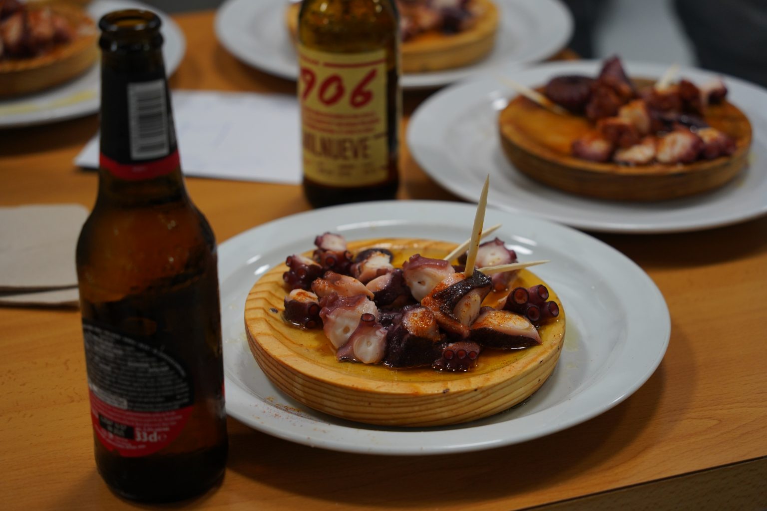 Alternative Text: Two wooden trays of pulpo a feira sitting in a table with beer bottles